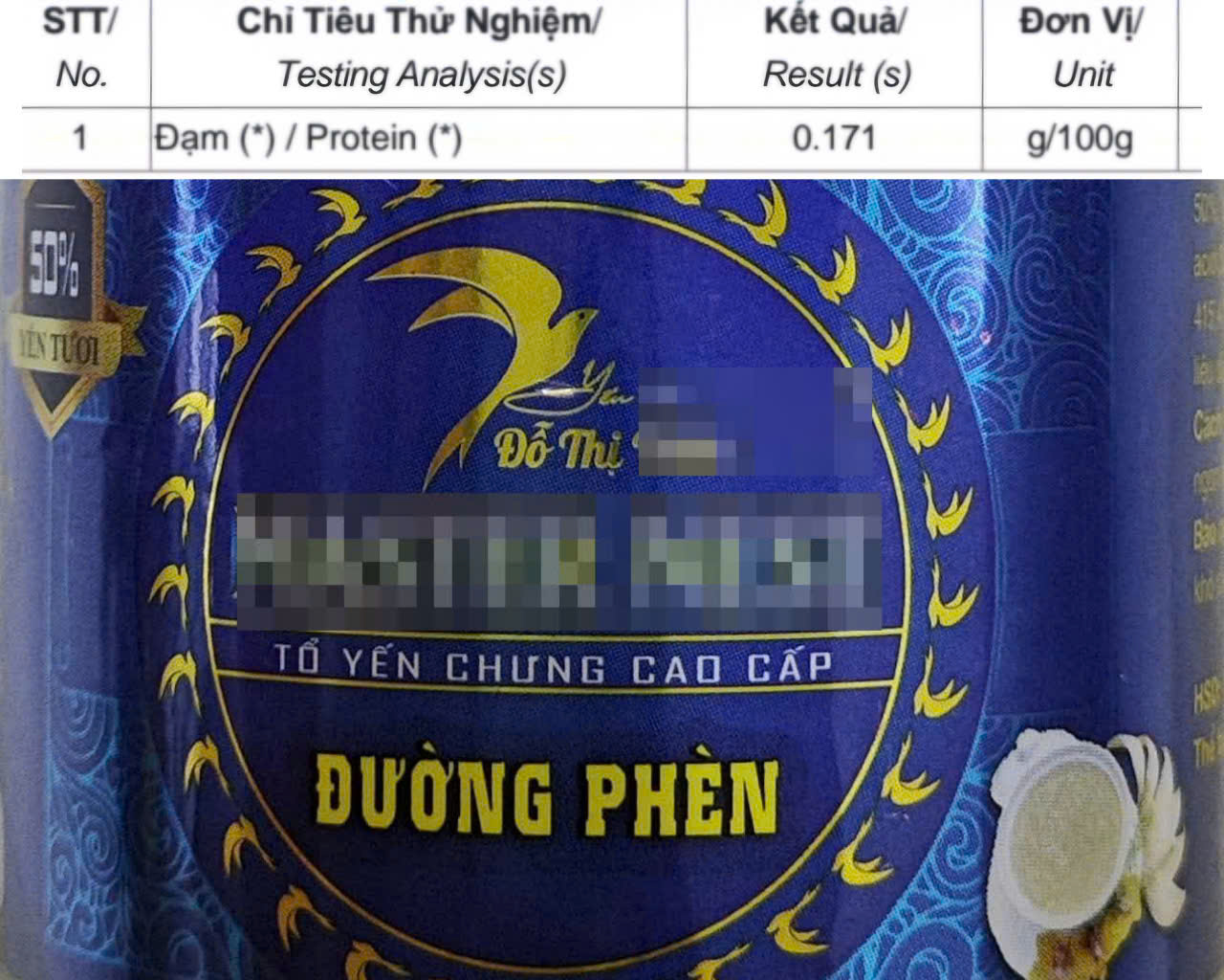 Đối với mẫu sản phẩm tổ yến chưng cao cấp đường phèn mang thương hiệu Đỗ Thị T- Master N, trên nhãn ghi 50% yến tươi, thực tế kết quả kiểm nghiệm đối chứng chỉ ra rằng, hàm lượng Đạm/Protein trong sản phẩm chỉ đạt 0,171 g/mg.