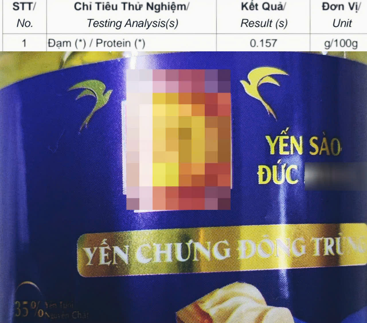 Sản phẩm yến chưng đông trùng hạ thảo mang thương hiệu yến sào Đức M., tại bảng thành phần ghi yến tươi 35%, kết quả mẫu kiểm nghiệm đối chứng về Đạm/Protein chỉ đạt 0.157 g/100g.