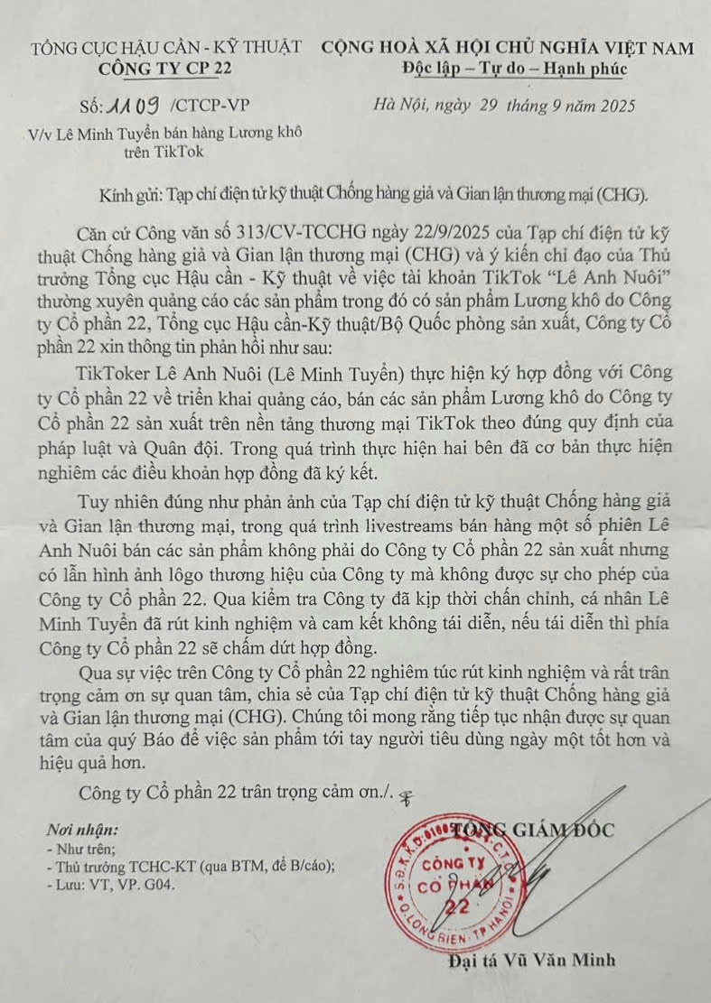 Trong buổi làm việc với phóng viên, ông Vũ Văn Minh, Tổng giám đốc Công ty Cổ phần 22 chỉ giải thích: “hình ảnh lương khô của đơn vị bị lẫn vào trong quá trình quảng cáo sản phẩm khác của Lê Anh Nuôi bán”. Đây là cách lý giải phi logic và thiếu cơ sở pháp lý. Bằng lập luận khoa học, có thể khẳng định rằng: việc một cá nhân làm "lẫn” sản phẩm và hình ảnh liên quan đến doanh nghiệp quốc phòng vào khuôn hình nhằm quảng cáo hoạt động thương mại là điều không được phép.