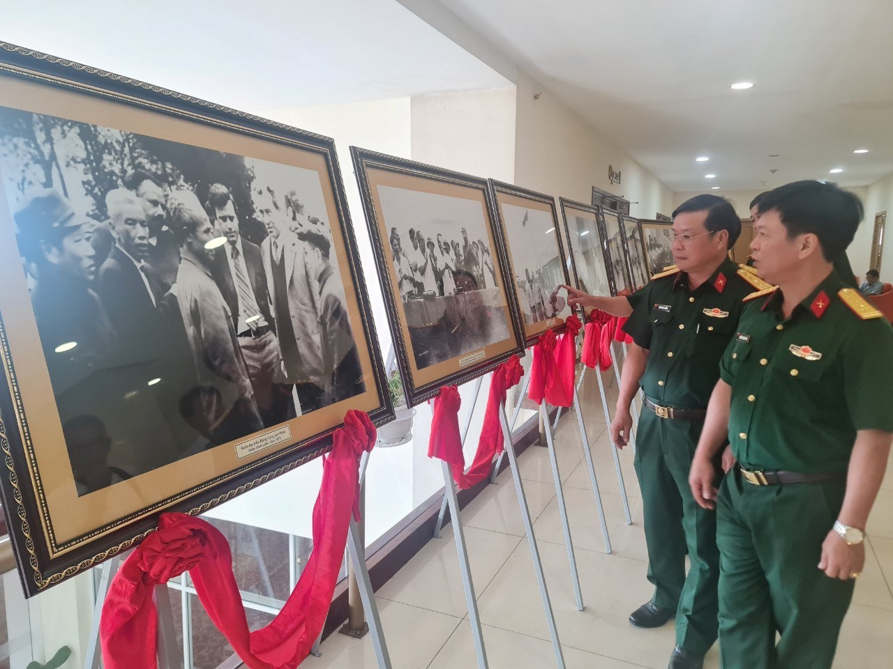 | Các đại biểu tham quan không gian trưng bày hình ảnh, tư liệu lịch sử về các hoạt động Chính phủ cách mạng lâm thời. |