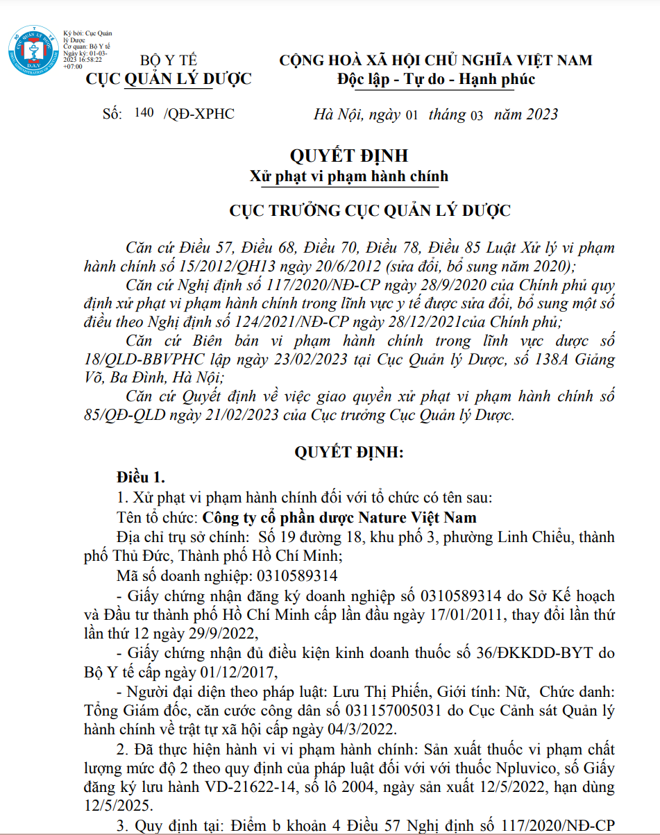 Quyết định xử phạt Công ty cổ phẩn dược Nature Việt Nam.Cục Quản lý Dược mới ra quyết định số 140/QĐ-XPHC xử phạt Công ty cổ phần dược Nature Việt Nam (địa chỉ tại số 19 đường 18, khu phố 3, phường Linh Chiểu, TP. Thủ Đức, TP. HCM) đã thực hiện hành vi sản xuất thuốc vi phạm chất lượng mức độ 2 theo quy định của pháp luật đối với thuốc Npluvico, số Giấy đăng ký lưu hành VD-21622-14, số lô 2004, ngày sản xuất 12/5/2022, hạn dùng 12/5/2025.