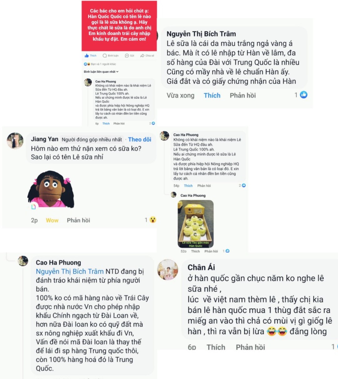 Còn với sản phẩm lê sữa Hàn Quốc, tài khoản Facebook của bạn C.H.P cho biết: “Không có khái niệm nào là khái niệm lê sữa đến từ Hàn Quốc, lê Trung Quốc 100%. Nếu ai chứng minh được lê sữa là lê Hàn Quốc và được phía hiệp hội Nông nghiệp Hàn Quốc trả lời bằng văn bản là có loại đó, em xin lấy tư cách cá nhân đền bao nhiêu tiền cũng được”. Tại tài khoản C.A cho rằng: “Ở Hàn Quốc gần chục năm không nghe thấy lê sữa...”.