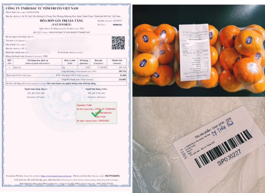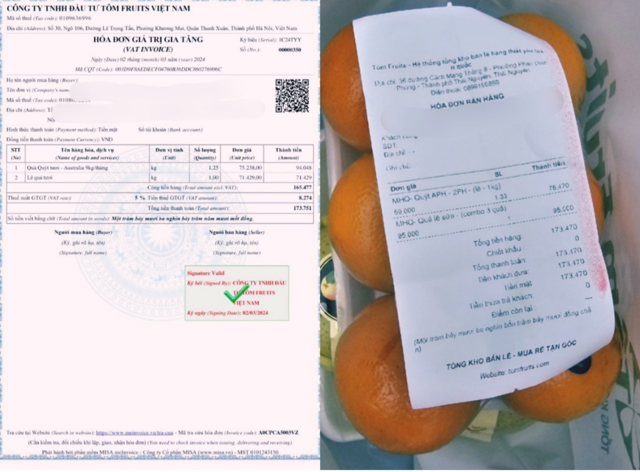 Cụ thể, ngày 29/2/2024, trao đổi thông tin với phóng viên, chị Đ.M.P cho biết: “Do tin tưởng vào lời giới thiệu của nhân viên cửa hàng trái cây nhập khẩu TÔM FRUIST (28 Trần Bình, phường Mỹ Đình, quận Nam Từ Liêm), tôi đã mua gần 4kg sản phẩm quýt Úc với giá 59.000 đồng/1kg, cùng lời đề nghị phía đơn vị cung cấp sản phẩm phải xuất hóa đơn giá trị gia tăng (VAT). Tuy nhiên, trong quá trình sử dụng, tôi phát hiện dòng chữ ghi xuất xứ Trung Quốc ở phần sau của khay sản phẩm. Điều lấy làm lạ, hóa đơn VAT do công ty TNHH đầu tư TÔM FRUITS Việt Nam phần ghi sản phẩm hàng hóa có ghi nhận là quýt Úc, với giá thành 72.429 đồng và số lượng cân thực tế được đơn vị này ghi là 2,88kg. Nghi ngờ về sản phẩm, tôi đến thắc mắc với phía cửa hàng thì nhận được câu trả lời của nhân viên nơi đây: "Em nói thật với chị quýt này là giống của Úc, nhưng mà ở bên Trung Quốc... Lê là lê sữa cũng của Trung Quốc, còn hóa đơn em sẽ hỏi lại cho chị. Phải chăng phía cửa hàng TÔM FRUITS 28 Trần Bình, phường Mỹ Đình, quận Nam Từ Liêm đang có dấu hiệu "mập mờ gian dối, nhằm lừa dối khách hàng về nguồn gốc xuất xứ những trái quýt đang bày bán tại đây”?