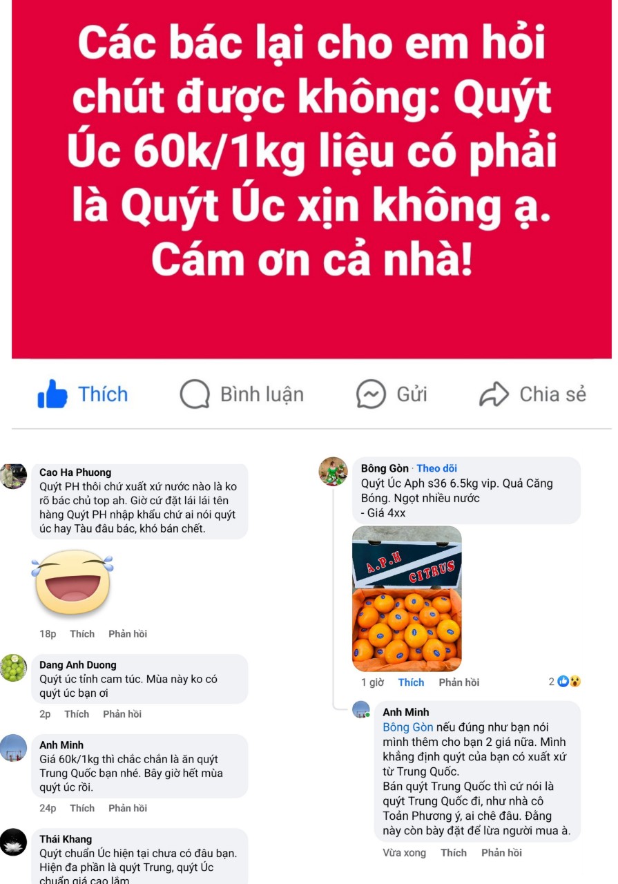 Cụ thể, tài khoản Facebook T.K cho biết: "Quýt Úc chuẩn hiện tại chưa có đâu. Hiện nay đa phần là quýt Trung Quốc. Quýt Úc chuẩn giá cao lắm". Hay như tài khoản Facebook M.A cho rằng: "Giá 60.000 đồng/1kg chắc chắn là quýt Trung Quốc rồi..."...