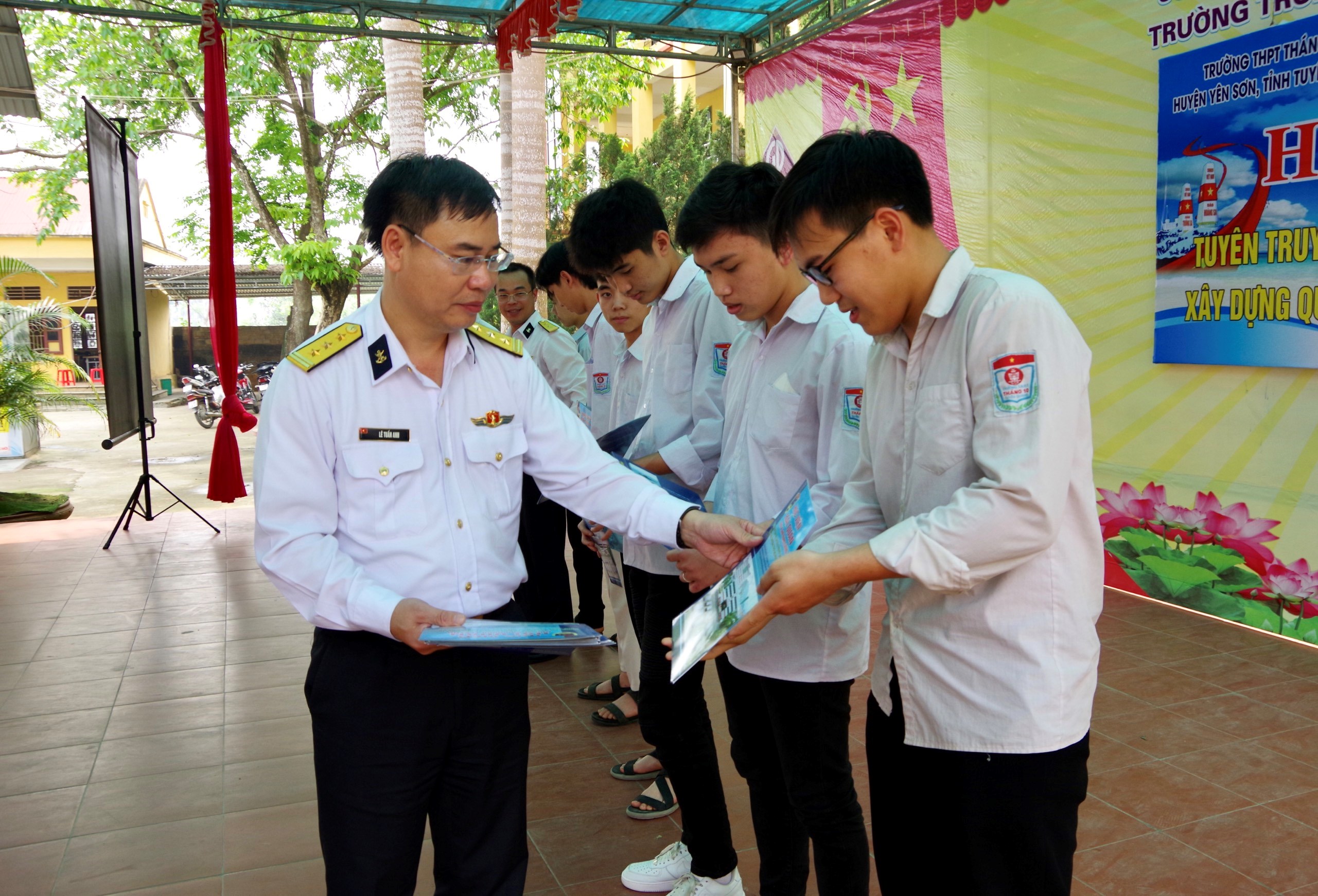| Báo cáo viên của Lữ đoàn 147 phát tờ rơi giới thiệu về Học viện Hải quân |