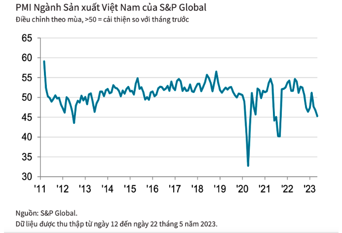 Andrew Harker, Giám đốc Kinh tế tại S&P Global Market Intelligence, đánh giá, số lượng đơn đặt hàng mới giảm mạnh trong tháng 5 là nguyên nhân dẫn đến lo ngại rằng ngành sản xuất của Việt Nam có thể trải qua thời kỳ suy giảm kéo dài chứ không phải chỉ là một giai đoạn giảm tạm thời. Các công ty đã có động thái đối phó tương ứng bằng cách giảm cả sản lượng, việc làm và hoạt động mua hàng. Nhu cầu hàng hóa đầu vào giảm đã bớt những áp lực còn lại với chuỗi cung ứng, nhờ đó thời gian giao hàng đã rút ngắn và chi phí đầu vào giảm.