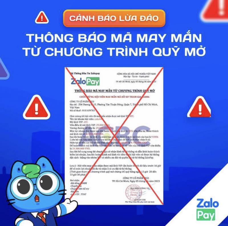 Thủ đoạn mới nhất của nhóm lừa đảo là vận hành một ứng dụng có tên “Zalopay chứng chỉ quỹ”, sử dụng danh nghĩa “Hệ thống đầu tư Zalopay” để tư vấn và mời gọi người dùng tham gia kiếm tiền. Tiếp đó, tổ chức này sẽ xây dựng lòng tin khách hàng thông qua việc tương tác, tư vấn tận tình cách thức kiếm tiền; “ban hành” nhiều văn bản hành chính giả để chứng thực độ uy tín, thậm chí ra văn bản khuyến cáo người dùng về đối tượng lừa đảo khác. Ban đầu, tổ chức lừa đảo vẫn hoàn trả tiền đúng hạn khi người dùng thực hiện giao dịch. Tuy nhiên, với các giao dịch lớn hơn về sau, nhóm lừa đảo sẽ biến mất khi đã nhận được tiền, người dùng không thể liên hệ được với những đầu mối trước đó.