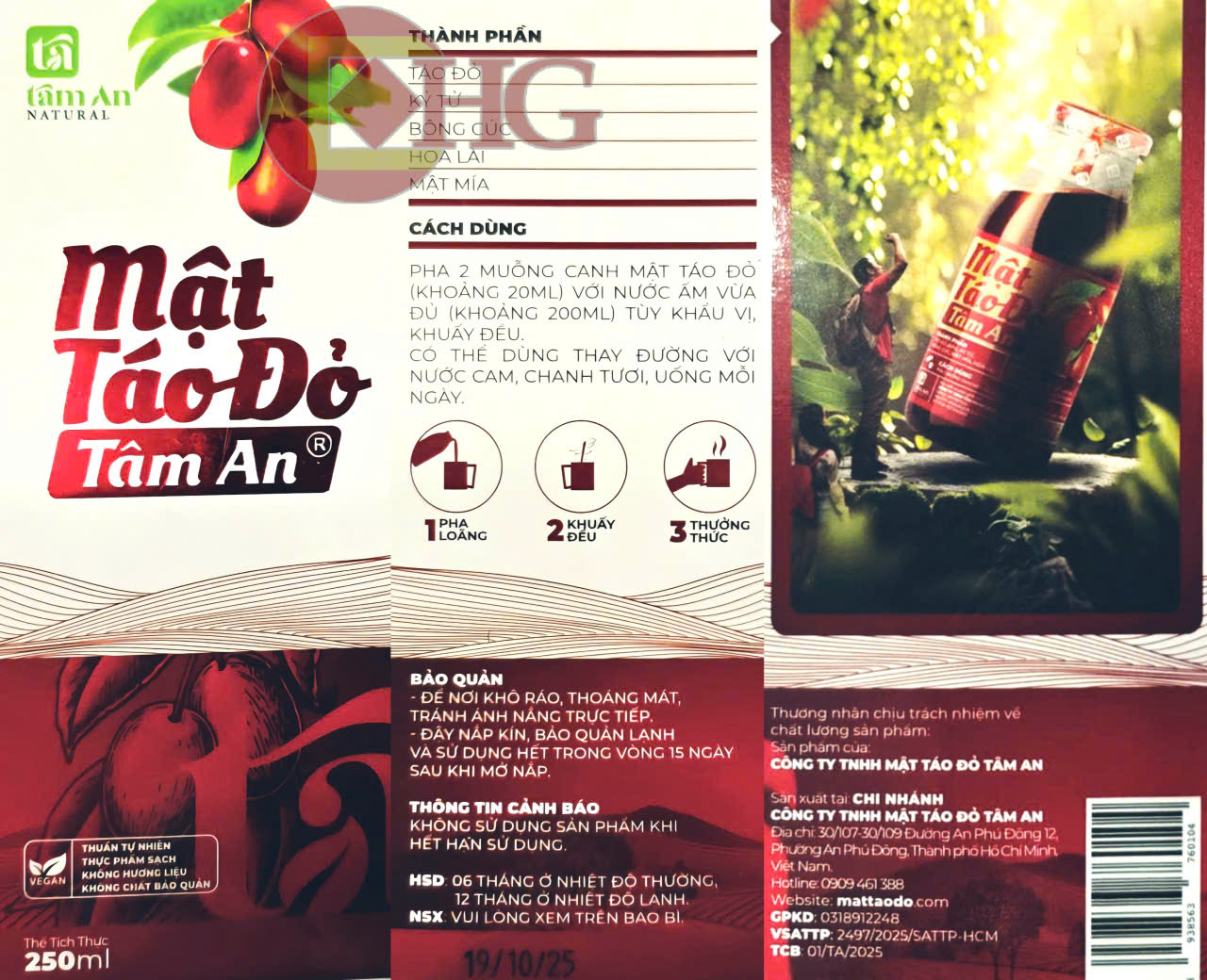 Trên nhãn của sản phẩm Mật táo đỏ Tâm An ghi: "Thuần tự nhiên"; "Thực phẩm sạch"... và chỉ là một dạng thực phẩm thông thường.