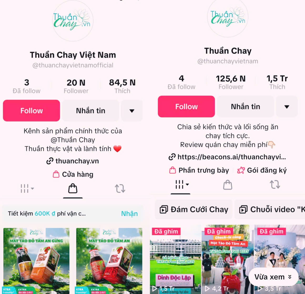 Đáng chú ý, tài khoản TikTok “Thuần Chay” (với gần 126 nghìn lượt theo dõi, 1,5 triệu lượt thích) và tài khoản TikTok “Thuần chay Việt Nam” (với hơn 20 nghìn người theo dõi, 84 nghìn lượt thích) đăng tải video ca ngợi “Mật táo đỏ Tâm An” như “thần dược của phụ nữ”, “thức uống bổ khí huyết tự nhiên”... Những video này mang giọng điệu y học nhưng lại gắn trực tiếp link bán hàng, tạo thành chuỗi tiêu thụ trá hình dưới vỏ bọc “trải nghiệm người dùng”.