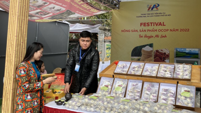 Bạn Lã Xuân Thanh giới thiệu về trà sen trong dịp Festival nông sản, sản phẩm OCOP năm 2022 tại huyện Mê Linh - Hà Nội