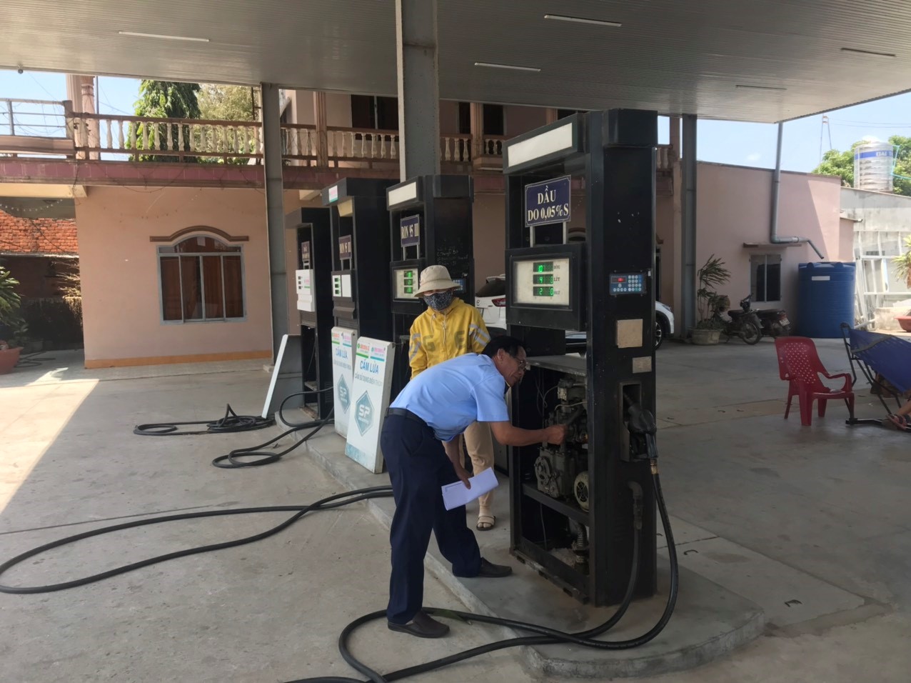 Lực lượng chức năng đang kiểm tra cột bơm xăng dầu tại doanh nghiệp.