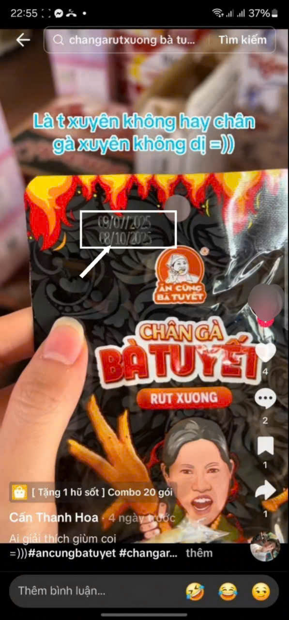 Tuy nhiên, thời gian gần đây trên nền tảng mạng xã hội TikTok xuất hiện đoạn video ngắn với nội dung một sản phẩm chân gà Bà Tuyết rút xương, trên nhãn in logo thương hiệu Ăn cùng bà Tuyết, có ngày sản xuất 09/07/2025 và hạn sử dụng là ngày 08/10/2025 (mặc dù lúc này mới là đầu tháng 3/2025) khiến không ít người tiêu dùng hoang mang lo lắng về quy trình sản xuất, quy trình kiểm soát chất lượng của thương hiệu này.