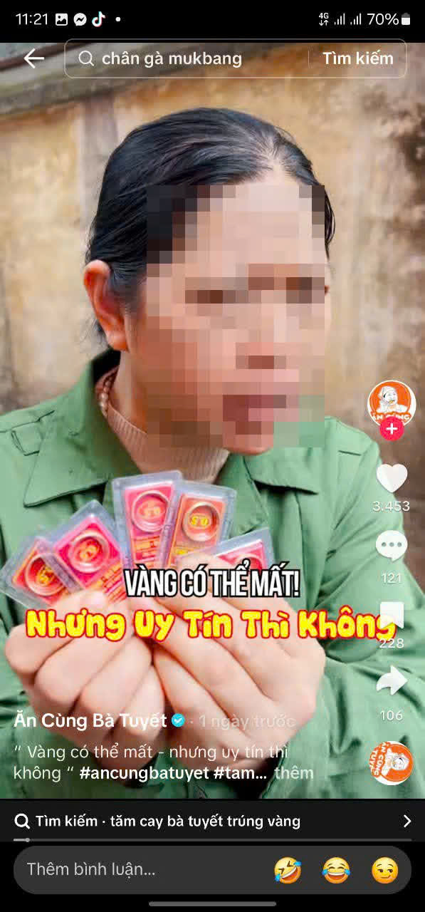 Bà Tuyết, một hot TikToker nổi tiếng trong cộng đồng học sinh, sinh viên. Người phụ nữ này được biết đến nhờ các video chân chất, hài hước, dễ thương, kèm theo đó là việc bà chia sẻ các món ăn vặt “siêu hot” mang thương hiệu của chính mình. Bên cạnh đó, các video ngắn, giới thiệu về quy trình chế biến sản phẩm, những lời quảng cáo hấp dẫn về sản phẩm luôn thu hút hàng nghìn lượt xem và chia sẻ, khiến những sản phẩm ăn vặt mang thương hiệu Ăn cùng bà Tuyết trở thành món ăn vặt yêu thích của rất nhiều bạn trẻ (đặc biệt là trẻ em), trong đó có các sản phẩm chân gà rút xương ăn liền. Điều đó khiến không ít người tiêu dùng, trong đó là các bậc phụ huynh tin tưởng, mua về cho con cái sử dụng và xem đây như một món ăn vặt hấp dẫn, tiện lợi, ngon miệng.