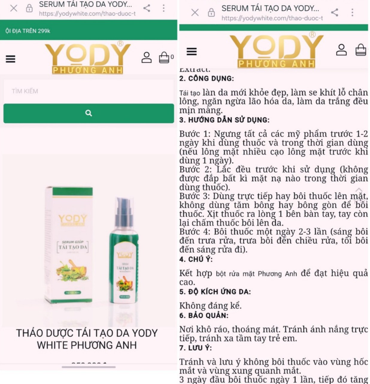 Website: https//www.yodyphuonganh.com (website này có chức năng giỏ hàng, thế nhưng lại chưa thông báo với Bộ Công thương)Tại website: https//www.yodyphuonganh.com (website này có chức năng giỏ hàng, thế nhưng lại chưa thông báo với Bộ Công thương) quảng cáo giới thiệu rất nhiều sản phẩm mang thương hiệu Yodywhite Phương Anh, trong đó có sản phẩm SERUM giúp tái tạo da. Điều đáng ngạc nhiên, website trên ngang nhiên quảng cáo sản phẩm SERUM giúp tái tạo da như một dạng thuốc.