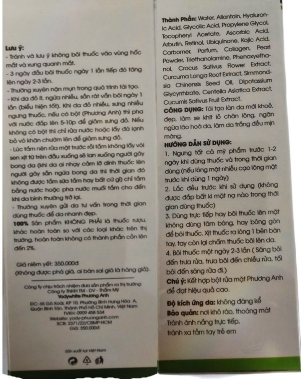 Sản phẩm SERUM giúp tái tạo da do Công ty Yodywhite Phương Anh chịu trách nhiệm đưa sản phẩm ra thị trường.Bởi khi tiếp cận thông tin quảng cáo sai sự thật, người mua sẵn sàng chi ra khoản tiền lớn để có được sản phẩm. Sau khi sử dụng, người tiêu dùng mới biết về những điều mà quảng cáo đề cập bởi chất lượng thực tế không giống như quảng cáo, thậm chí có nhiều sản phẩm ở mức độ kém, gây nguy hại. Không những thế, tình trạng quảng cáo sai sự thật còn vi phạm đạo đức kinh doanh, làm rối loạn thị trường mua bán, trao đổi hàng hóa.