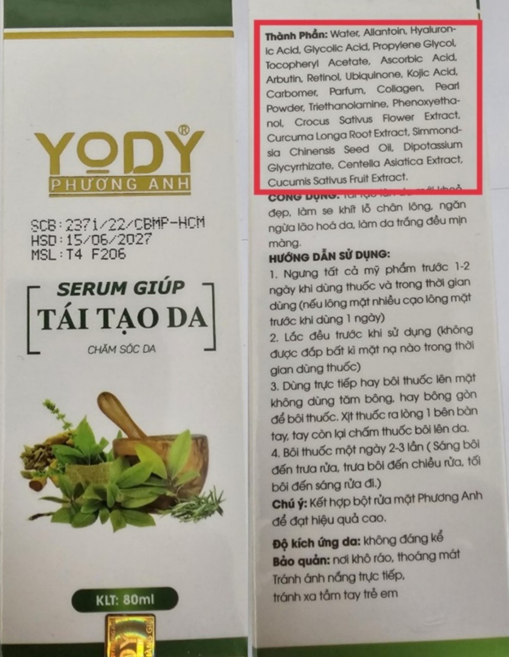 Có thể thấy sản phẩm SERUM giúp tái tạo da do Công ty Yodywhite Phương Anh chịu trách nhiệm đưa sản phẩm ra thị trường được giới thiệu và bán trên các nền tảng mạng xã hội, trên sàn TMĐT có giá thành “bình dân”, khiến người tiêu dùng dễ dàng xuống tiền mua. Bởi vậy nhãn hàng này nhanh chóng trở thành mặt hàng được nhiều người lựa chọn. Tuy nhiên nếu không tìm hiểu kỹ về chất lượng, cũng như đảm bảo an toàn của sản phẩm, hậu quả để lại không chỉ là “tiền mất mà tật còn mang” cho chính người tin dùng. Điều đó được minh chứng bởi bảng thành phần của sản phẩm SERUM giúp tái tạo da.