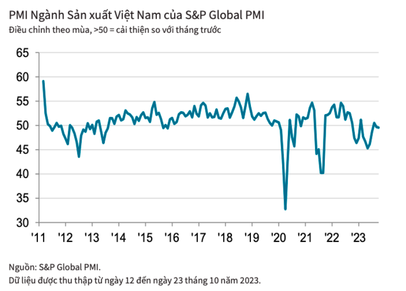 (CHG) Ngày 1/11, S&P Global công bố chỉ số Nhà quản trị mua hàng (PMI) ngành sản xuất Việt Nam vẫn nằm dưới ngưỡng 50 điểm trong tháng 10, khi giảm về mức 49,6 so với 49,7 điểm của tháng 9. Kết quả này cho thấy sức khỏe của ngành sản xuất suy giảm tháng thứ hai liên tiếp.