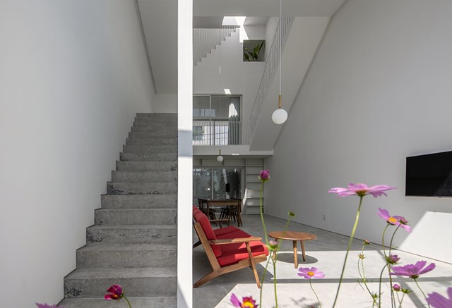 "Nhà Dạo Bước" tọa lạc trên khu đất rộng 251 m² tại thành phố Đà Nẵng. Bên cạnh ý tưởng đưa sàn catwalk vào nhà, công trình còn sử dụng các "hộp nhiệt đới" để lấy ánh sáng tự nhiên và giúp không khí trong nhà được lưu thông.Phòng khách được thiết kế tương tự như sàn catwalk. Nội thất tối giản cùng khoảng thông tầng giúp không gian rộng rãi, thoáng mát hơn.Hệ cửa kính sát trần giúp ngôi nhà đón ánh sáng tự nhiên.Khu vực bếp được được bố trí dựa theo chiều dọc của tường. Phòng khách và bếp được gộp chung trong một không gian giúp tầm nhìn tầng trệt thông thoáng hơn.Tấm rèm trắng kéo dài từ trần đến sàn được bố trí để che đi khu bếp khi gia chủ cần sử dụng không gian để trưng bàyCuối tầng trệt là khu sân sau được trồng thêm cây xanh để ngăn chặn bức xạ mặt trời gay gắt, tiếng ồn đường phố và khói bụi. Quang cảnh thiên nhiên có nắng, gió và không khí trong lành giúp gia chủ tận hưởng những phút giây bình yên, thư thái.Điểm nhấn của ngôi nhà là đường đi catwalk bắt đầu từ tầng trệt, sau đó lên cầu thang rồi băng qua hành lang và tiếp tục đi đến tầng trên cùng.Tầng 2 và 3 là không gian phòng ngủ Từ phòng ngủ tầng 2 cũng có nhìn ra khu vườn tràn ngập hoa lá ở phía sau nhàLối đi trong nhà được bố trí theo hình xoắn ốc, bao quanh khoảng thông tầng có tác dụng kết nối các không gian trong nhà. Bên cạnh đó, gia chủ còn có thể thay đổi linh hoạt góc nhìn khi di chuyển qua từng khu vực.Một điểm đặc biệt khác của ngôi nhà là năm chiếc “hộp nhiệt đới” đặt trên mái nhà đóng vai trò như giếng trời, vừa có tác dụng chiếu sáng, vừa giúp lưu thông không khí. Đêm đến, gia chủ còn có thể ngắm nhìn mặt trăng qua các khe hở trên mái nhà.Nhờ giếng trời và khoảng thông tầng, nơi nào trong nhà cũng trần ngập ánh sáng tự nhiên và không khí trong lành.