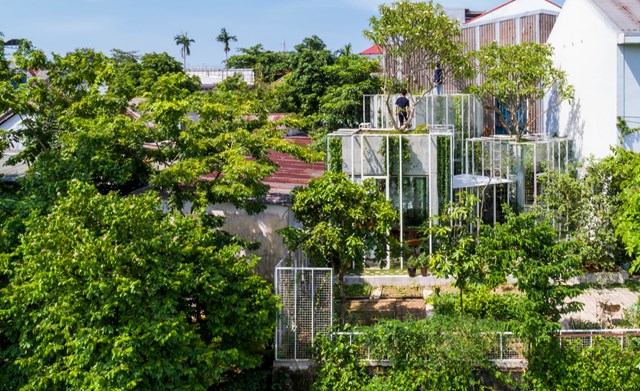 Công trình Labri House tọa lạc trên khu đất rộng 100 m² ở Huế, được thiết kế bởi studio Nguyễn Khải Architects & Associates. Ngôi nhà là tổ ấm của một cặp vợ chồng trong tuổi xế chiều, qua đó giúp cặp đôi trải qua phần đời còn lại một cách bình yên và hạnh phúc.Mảnh đất xây dựng ngôi nhà nằm ở cuối một con hẻm nhỏ của thành phố Huế thơ mộng, giáp với 1 trong 9 hồ nước trong khu vực. Đây là vị trí hoàn hảo giúp đội ngũ kiến trúc sư nảy sinh ý tưởng tạo nên Labri House."L'abri" trong tiếng Pháp có nghĩa là nơi trú ẩn yên bình. Đúng như tên gọi, đây thực sự là một nơi trú ẩn bí mật, không dễ tìm thấy trên bản đồ hay thậm chí là khi quan sát từ xa.Nhìn từ bên ngoài, ngôi nhà mang lại cảm giác như một cái cây lớn mọc lên từ mặt đất, sinh trưởng giữa khu rừng chứ không phải một công trình được xây bởi bàn tay con người.Ngôi nhà chia thành 4 khối tương ứng 4 không gian phòng khách, phòng bếp, phòng ngủ và khu vệ sinh. Xung quanh không gian được bao phủ bởi 3 lớp kính, dây leo và bê tông từ ngoài vào trong. Phía trên nóc nhà được trồng thêm cây xanh. Lớp kính trong suốt được sử dụng thay thế những bức tường truyền thống cùng với hàng dây leo bao phủ bên ngoài mang lại trải nghiệm gần gũi với thiên nhiên cho gia chủ, đồng thời giúp ánh sáng tự nhiên dễ dàng lan tỏa đến từng không gian trong nhà.Các lối đi đều được trải sỏi và đá tự nhiên. Không gian phòng khách không quá lớn. Nội thất gỗ thiết kế tối giản nhưng vẫn đảm bảo nhu cầu cơ bản của gia chủ.Khu bếp hiện đại với đầy đủ tiện nghi. Kính sát trần cùng giàn leo bao bọc xung quanh không gian phòng ngủ mang đến cảm giác hoang sơ. Đặc biệt, gia chủ còn có thể vừa nghỉ ngơi vừa ngắm bầu trời đêm đầy sao.Các vách tường ngăn cách từng khu vực đã được lược bỏ. Dù đứng ở không gian nào, gia chủ cũng có thể quan sát được các vị trí khác của ngôi nhà, từ phòng bếp đến phòng ngủ, từ sân trước đến sân sau và cả cây hoa sứ trên tầng thượng. Cây cối quanh nhà thu hút nhiều loài chim chóc và sinh vật nhỏ khiến nơi đây biến thành một khu rừng nhỏ sinh động. Dây leo được sử dụng như một vật dụng trang trí len lỏi trên bức tường kính vừa mang đến sự riêng tư cho không gian vừa có chức năng lọc không khí. Bên cạnh đó, cây hoa sứ cũng được phủ xanh phần nóc nhà. Vào mùa khô, những tán lá xum xuê bao trùm cả tầng thượng có tác dụng che chắn căn nhà khỏi cái nắng gay gắt.Labri là ngôi nhà dành cho những ai muốn tìm kiếm sự bình yên và sống chan hòa với thiên nhiên.