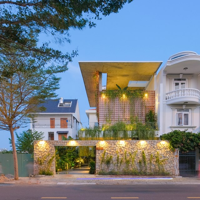 "Freedom House" tọa lạc giữa lòng thành phố Nha Trang xinh đẹp. Dự án được hoàn thành trong 1 năm với diện tích 240m². Ngôi nhà mang phong cách giao thoa giữa kiến trúc nhiệt đới đương đại và kiến trúc nhiệt đới bản địa truyền thống trong bối cảnh môi trường đô thị và văn hóa sống hiện đại.Vật liệu xây nhà là những loại phổ biến trên thị trường kết hợp với vật liệu địa phương như gỗ, đá tự nhiên hoặc vật liệu thủ công như đá mài.Nhìn từ bên ngoài cũng có thể thấy ngôi nhà "xanh" đến thế nào. Rất nhiều loại cây từ cây ăn quả, cây cảnh đến các loài hoa được trồng khắp nơi trong khuôn viên nhà.Hồ cá Koi cạnh nhà giúp điều hòa nhiệt độ. Đây cũng là khu vực để cả gia đình ngồi trò chuyện và thư giãn khi rảnh rỗi. Thiết kế sử dụng giàn lưới 3D cách điệu từ chi tiết lam chắn nắng của nhà truyền thống, tạo thành khung giàn cho dây leo phát triển tạo thành một "bức rèm xanh" làm giảm bức xạ nhiệt, tăng thêm độ mát mẻ cho mái ấm của gia chủ.Khoảng sân rộng lớn rợp bóng cây là nơi vui chơi của các con. Phòng khách bài trí đơn giản giúp cho không gian có chiều sâu và thoáng đãng hơn.Cửa phòng khách được thiết kế chạm trần, mở ra khoảng không rộng lớn để đón ánh sáng tối đa, kết nối con người với thiên nhiên. Bàn ăn và khu bếp liền kề với phòng khách, phá bỏ giới hạn, kéo gần các thành viên lại với nhau qua các hoạt động thường ngày. Không gian trải rộng trên cùng một mặt phẳng gia tăng đối lưu không khí và thông gió tự nhiên cho ngôi nhà trong môi trường nhiệt đới ẩm của Nha Trang.Tủ bếp chủ yếu sử dụng chất liệu gỗ. Ánh sáng đèn vàng làm tăng thêm sự ấm cúng cho mỗi bữa cơm gia đình.Giếng trời và cây xanh được bố trí phía trên cầu thang gỗ dẫn lên tầng 2.Hành lang và cầu thang tràn ngập ánh nắng tự nhiên từ giếng trời.Tầng 2 là phòng ngủ của gia đìnhLối đi nhỏ giữa hai phòng ngủ đóng vai trò như vật liên kết, thu nhỏ khoảng cách giữa các thành viên trong gia đình. Cửa phòng ngủ dùng hệ cửa đẩy kiểu Nhật giúp tiết kiệm diện tích hơn so với cửa thông thường, tạo hiệu ứng không gian rộng rãi. Ban công ngăn cách với phòng ngủ bằng hệ thống cửa sát đất rộng lớn để đón nắng và gió giúp nơi nghỉ ngơi của gia chủ luôn thông thoáng. Khu vực khô và ướt của phòng vệ sinh được chia tách bởi một vườn cây nhỏ.Mọi ngóc ngách của ngôi nhà đều tràn ngập ánh nắng tự nhiên và cây xanh.
