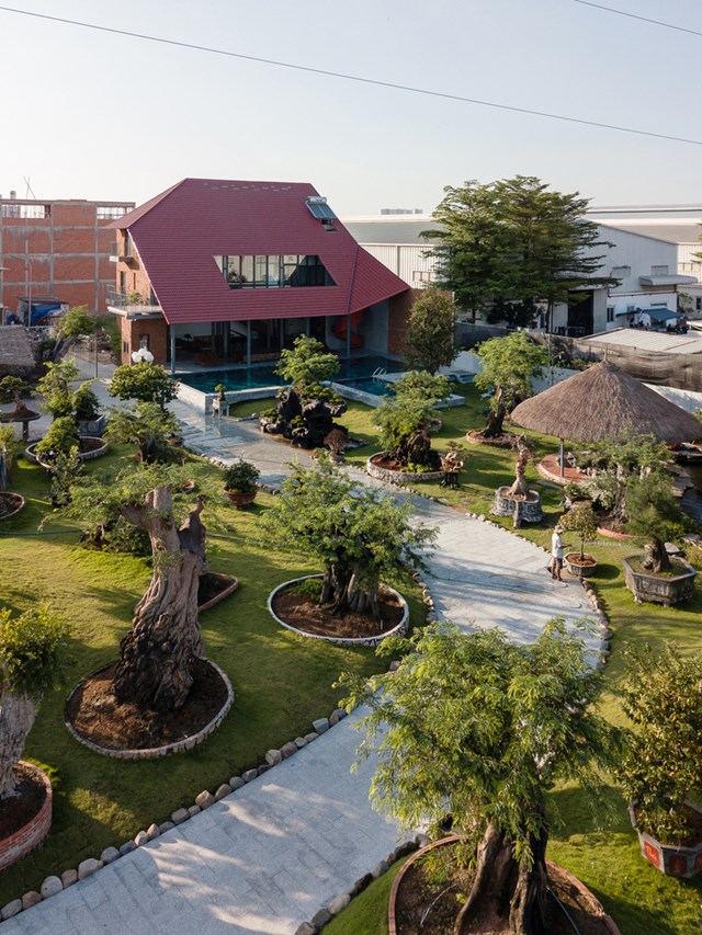 Nhà mái gấp nằm trong một khuôn viên rộng lớn, đa chức năng với: bể bơi, sân vườn, sân tennis, sân giải trí,... phục vụ cho mục đích nghỉ dưỡng cuối tuần của gia chủ.