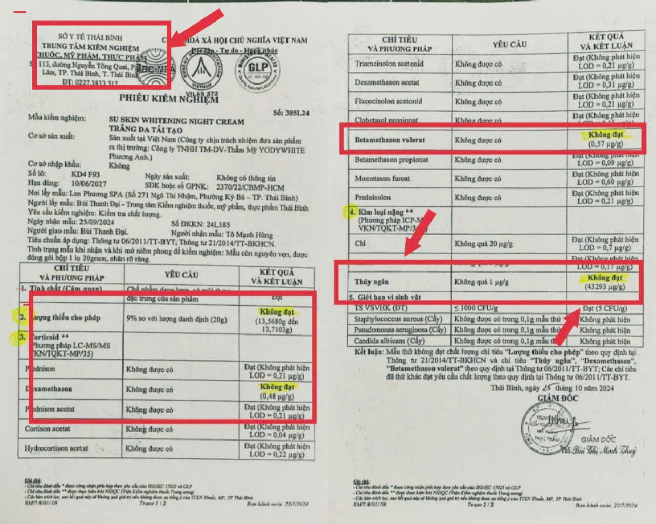 Kết luận của cơ quan chức năng, sản phẩm Suskin Whitening Night Cream do Công ty Yody Phương Anh chịu trách nhiệm đưa ra thị trường dương tính với Corticoid và thủy ngân vượt hơn 43 nghìn lần cho phép của Bộ Y tế.