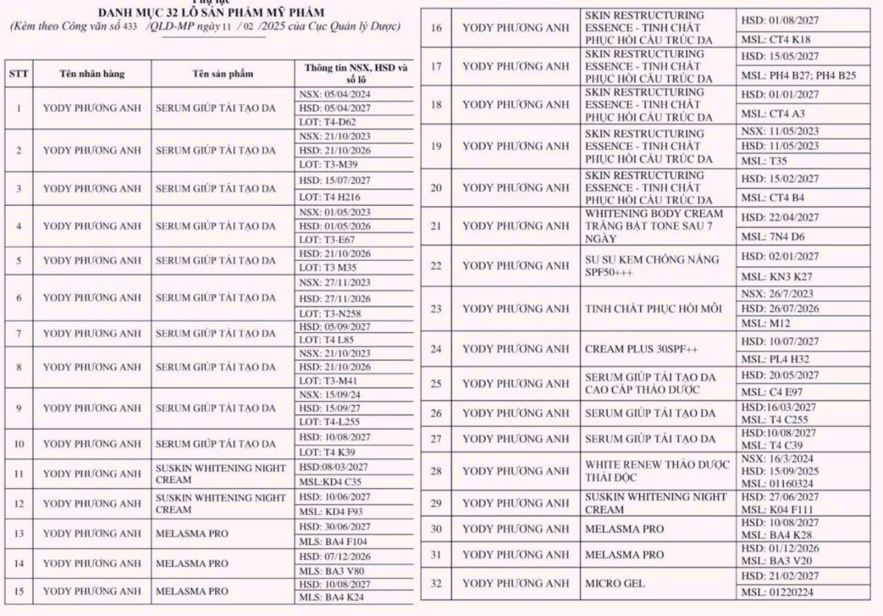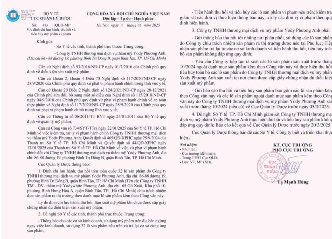 Cơ quan chức năng liên tục ra thông báo xử phạt, thu hồi và buộc tiêu hủy sản phẩm đối với mỹ phẩm mang thương hiệu Yody Phương Anh.