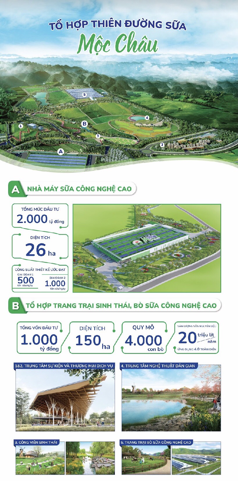“Tổ hợp thiên đường sữa Mộc Châu” ra đời với hai hạng mục chính: Trang trại sinh thái, bò sữa công nghệ cao Mộc Châu và Nhà máy chế biến sữa công nghệ cao Mộc Châu.