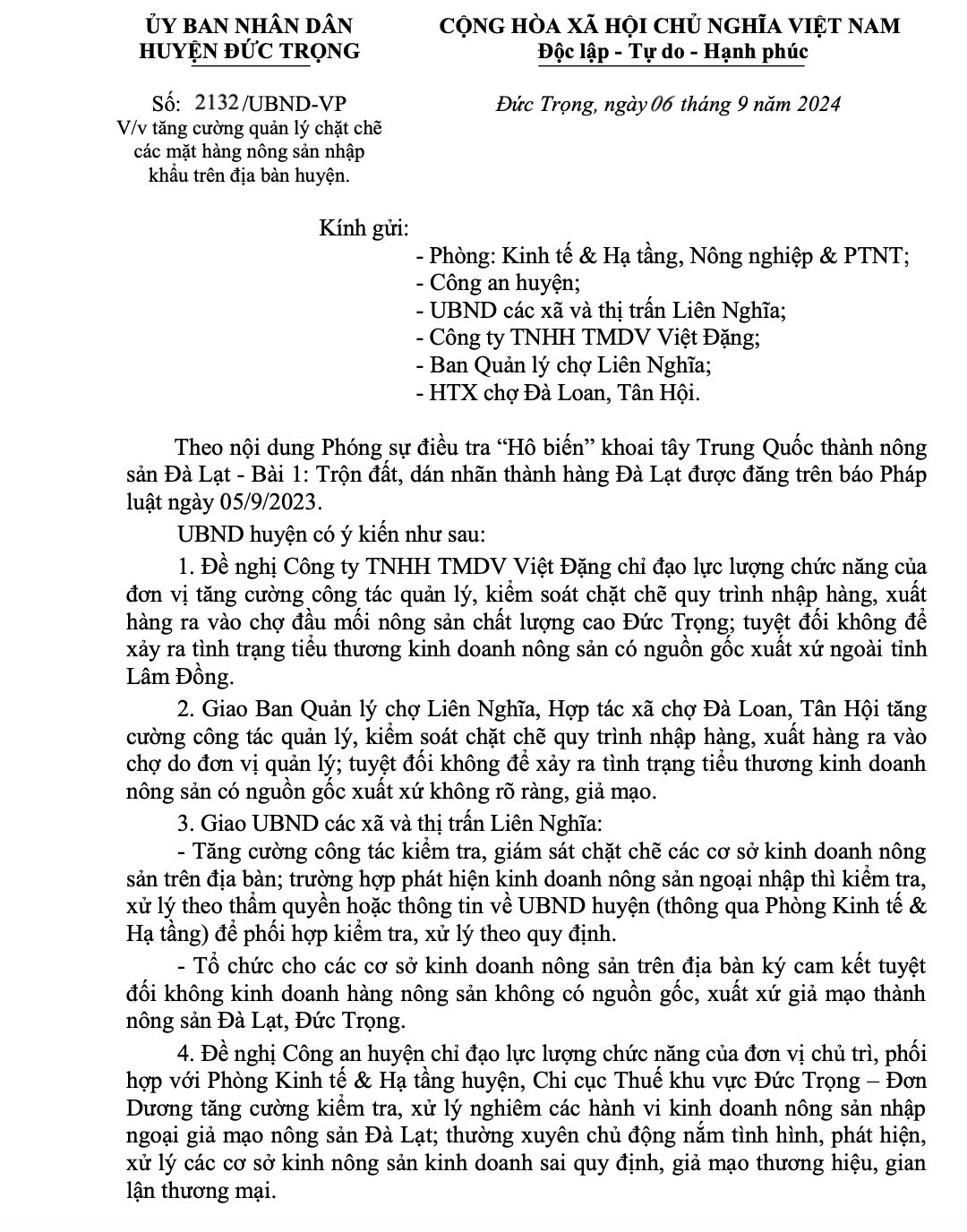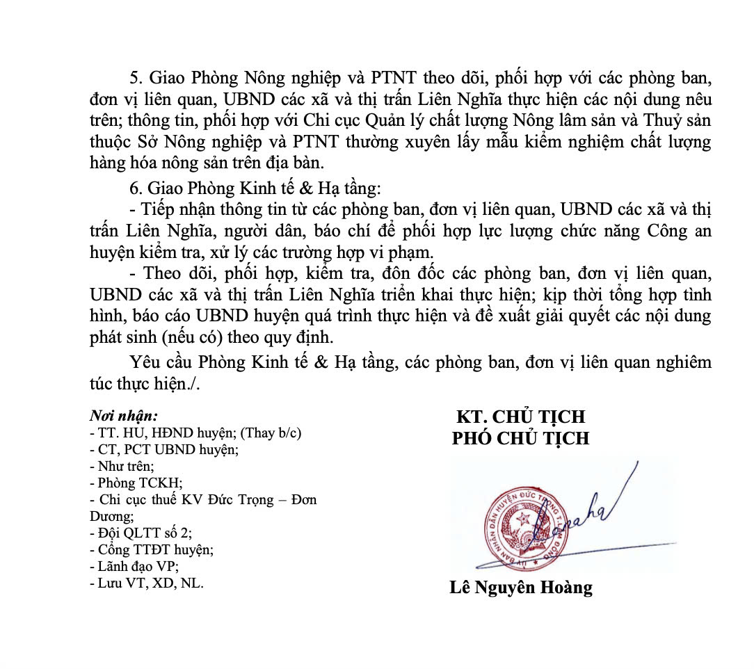 Bên cạnh đó, UBND huyện cũng giao UBND các xã và thị trấn Liên Nghĩa tăng cường công tác kiểm tra, giám sát chặt chẽ các cơ sở kinh doanh nông sản trên địa bàn. Trường hợp phát hiện kinh doanh nông sản ngoại nhập thì kiểm tra, xử lý theo thẩm quyền hoặc thông tin về UBND huyện để phối hợp kiểm tra, xử lý.