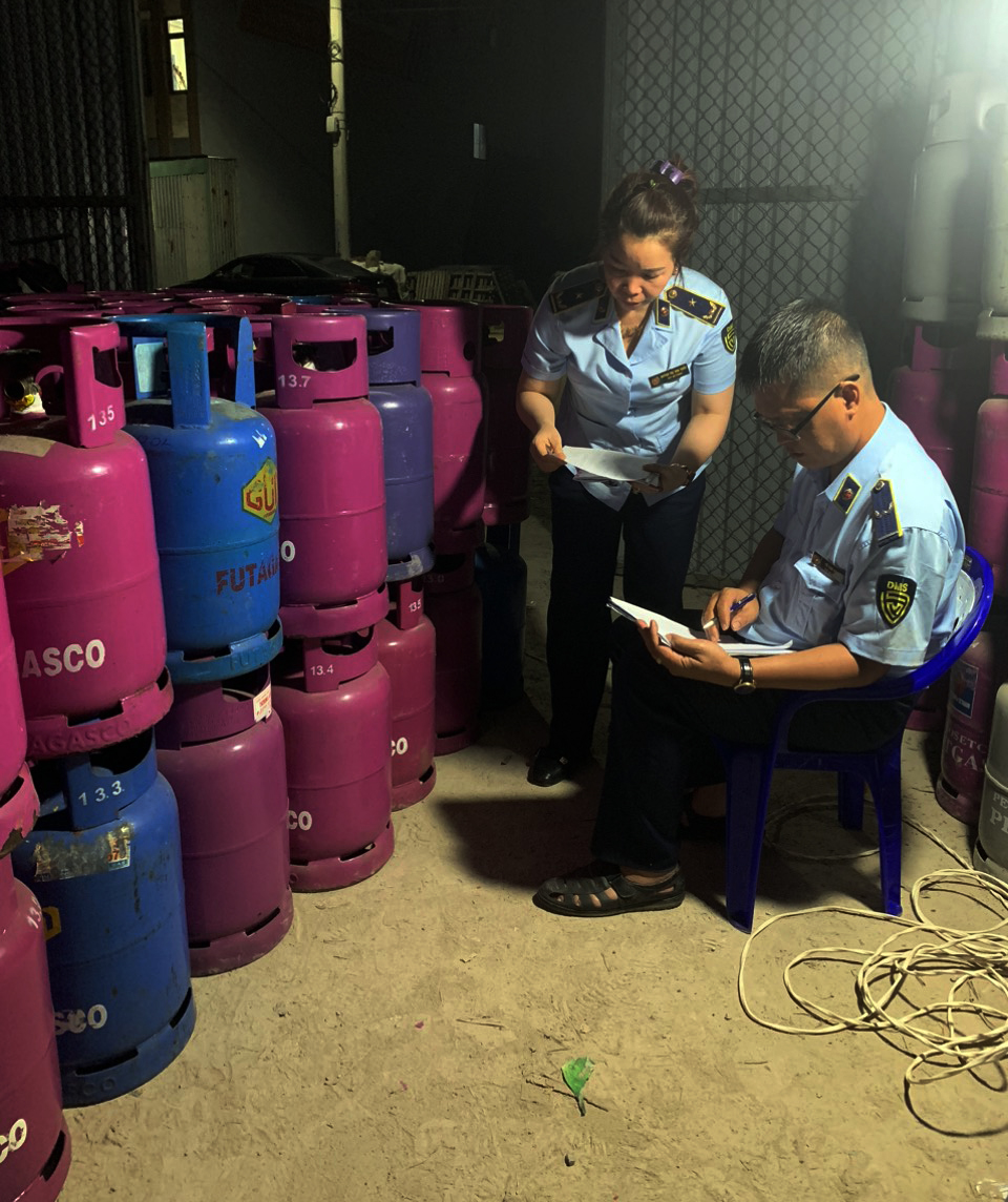 Tại thời điểm khám, phát hiện 508 chai LPG loại 12kg, mang nhiều nhãn hiệu khác nhau: FUTAGASCO, PETROVIETNAM (PV GAS), PETROMIENTRUNG (PM GAS), VOGAS không có hóa đơn chứng từ và các giấy tờ liên quan.