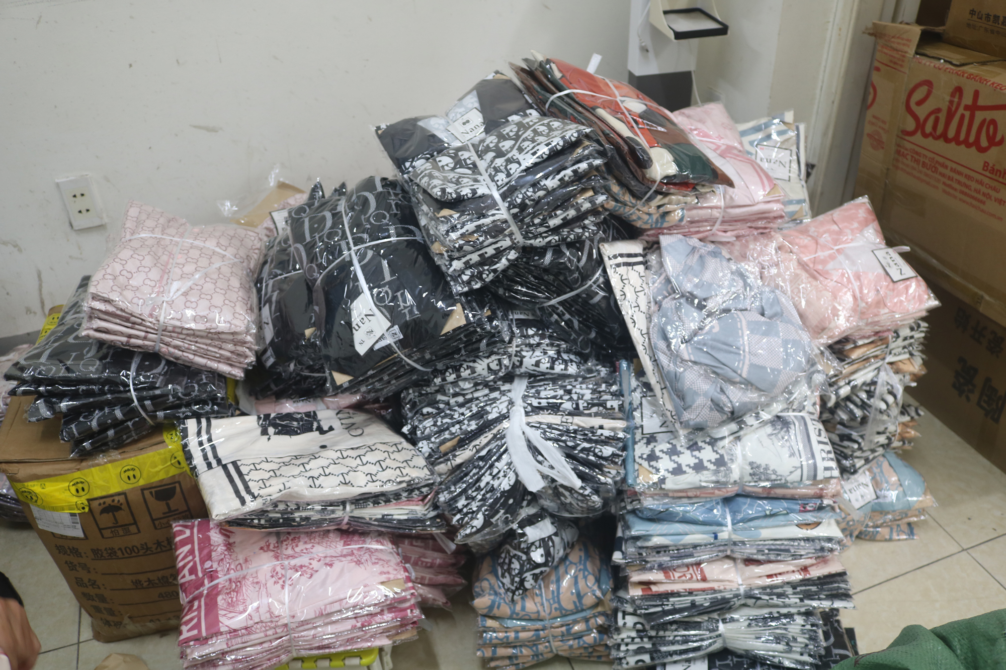 Lực lượng chức năng tiến hành lập hồ sơ số hàng hóa có dấu hiệu giả mạo các nhãn hiệu để tiếp tục xử lý theo quy định.Qua kiểm tra phương tiện nói trên, phát hiện trên xe có nhiều hàng hóa gồm 200 cái đèn pin đội đầu sạc điện nhãn hiệu LEISHE; 258 cái kéo cắt tóc và tỉa tóc các loại và 108 hộp bịch thuốc nhuộm tóc các loại do nước ngoài sản xuất; 1.744 bộ quần áo Pijama nữ các loại do Việt Nam sản xuất và không rõ nguồn gốc xuất xứ có dấu hiệu giả mạo các nhãn hiệu LOUIS VUITTON, GUCCI, YVES SAINT LARENT và CHISTIAN DIOR. Ngoài ra trên phương tiện còn vận chuyển 01 chiếc xe mô tô địa hình hai bánh do nước ngoài sản xuất không có giấy tờ chứng nhận đăng ký xe mô tô, xe gắn máy, không có biển kiểm soát. Trị giá hàng hóa vi phạm ước tính hơn 400 triệu đồng.