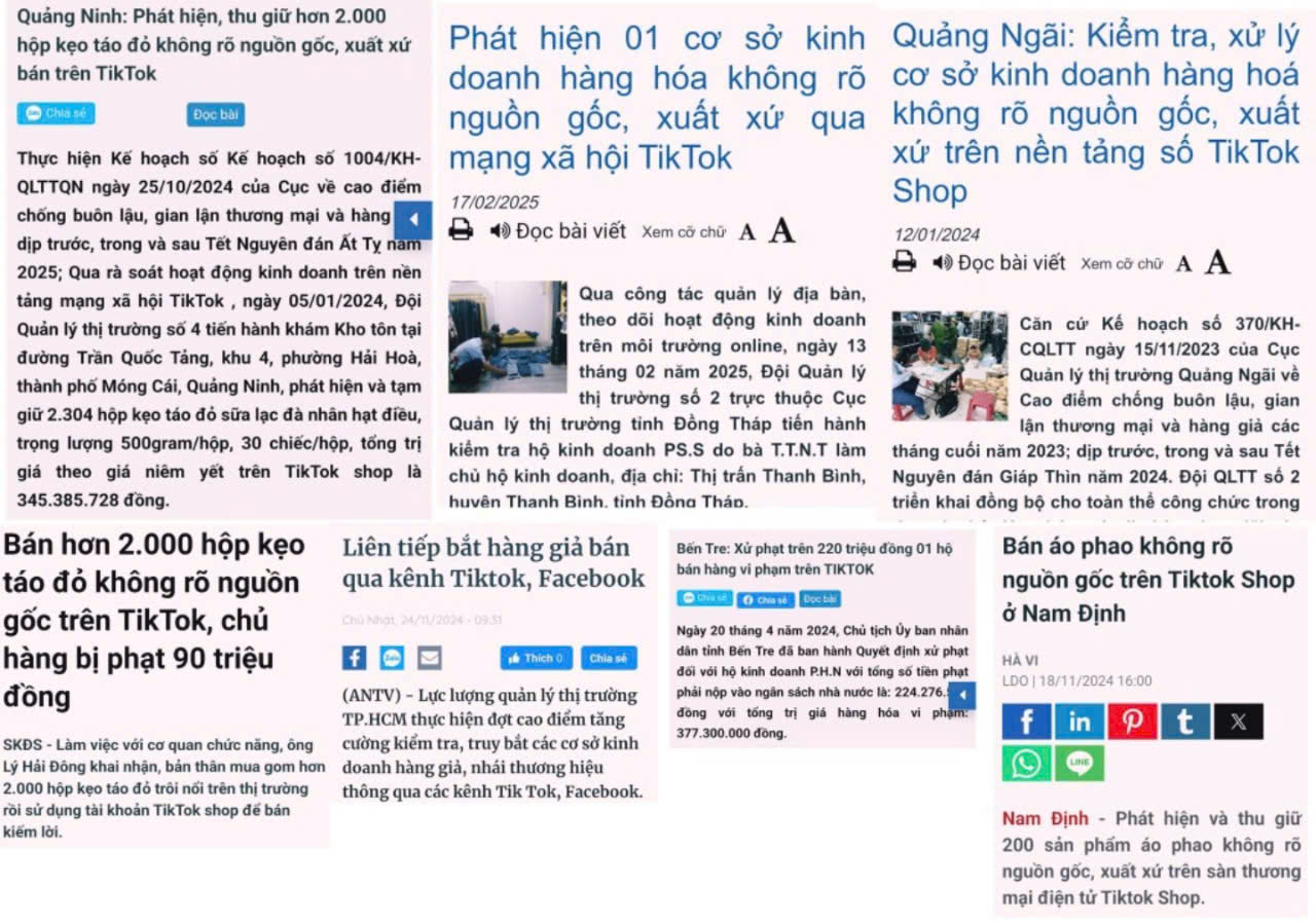 Cơ quan chức năng phát hiện và xử phạt các tổ chức, cá nhân kinh doanh hàng hóa vi phạm các quy định pháp luật trên nền tảng mạng xã hội video ngắn Tik Tok.Nhiều sản phẩm không rõ ràng về xuất xứ, chứa chất cấm, trong đó có cả những sản phẩm đã bị cơ quan chức năng ra quyết định xử phạt và thu hồi, nhiều sản phẩm kém chất lượng, thậm chí có cả những sản phẩm có dấu hiệu giả mạo các nhãn hiệu đã được đăng ký bảo hộ tại Việt Nam. Điều này khiến người tiêu dùng dễ dàng rơi vào “bẫy” của những tổ chức, cá nhân có tư duy kinh doanh bất chính.