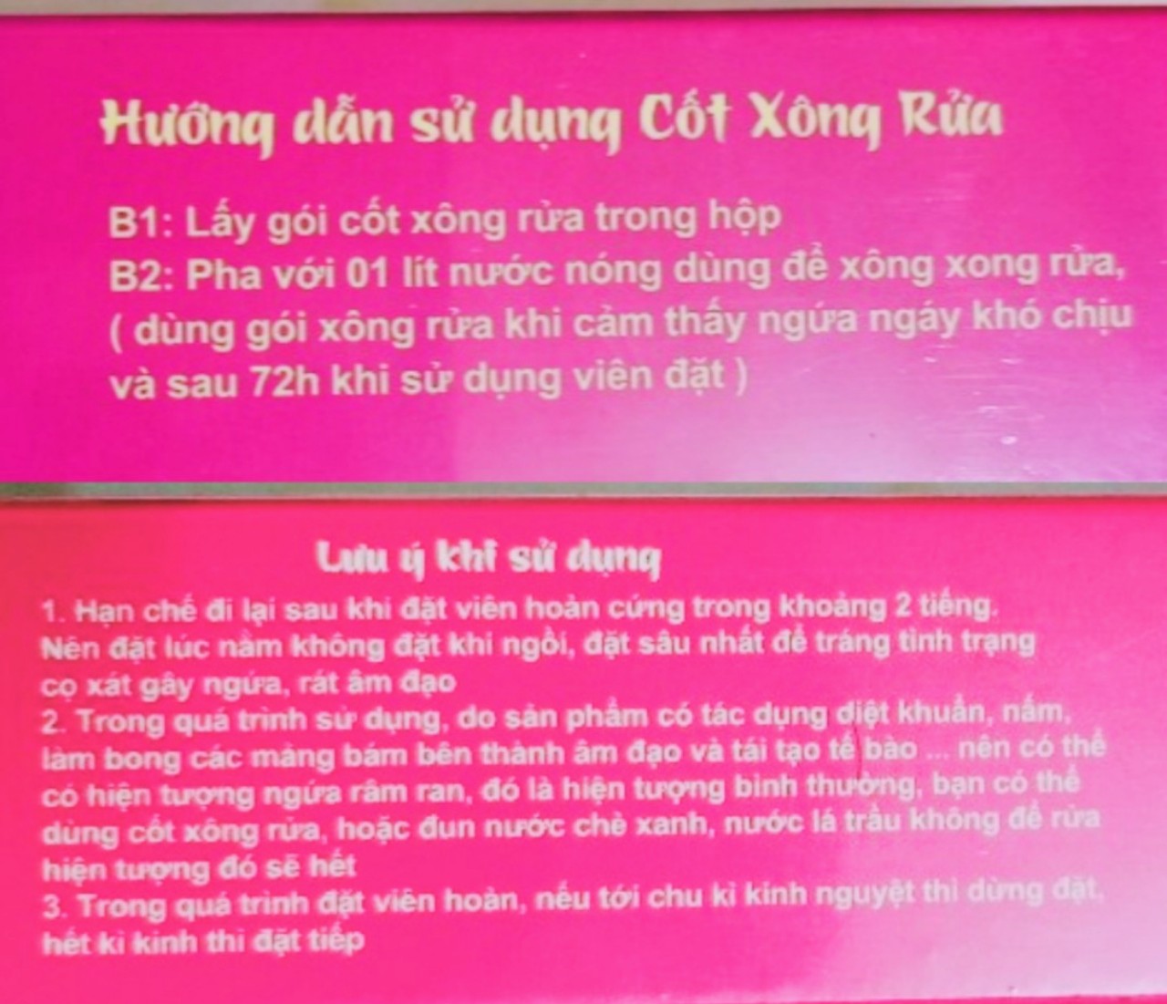 Tuy nhiên, với sản phẩm bán kèm có tên thương mại Cốt Xông Rửa, trên nhãn sản phẩm chỉ ghi vẻn vẹn vài dòng liên quan đến việc “Hỗ trợ điều trị”; “Lưu ý sử dụng”; “Hướng dẫn sử dụng”. Dòng chữ ghi ngày sản xuất và hạn sử được viết tắt bằng các ký tự tiếng nước ngoài (Lot: 05/04/2023; MFG: 05/04/2023; EXP: 04/04/2026).