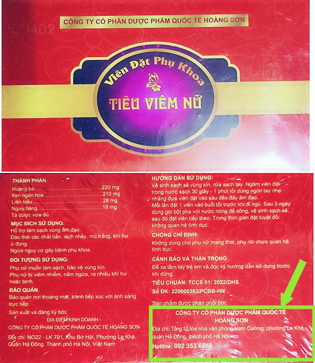 Quan sát thực tế trên nhãn hàng hóa do người tiêu dùng cung cấp, sản phẩm Tiêu Viêm Nữ có mã số HS1402; số tiêu chuẩn: TCCS01:2022/DHS; số đăng ký 220000383/PCBB-HN; sản xuất, đăng ký và phân phối là Công ty Cổ phần dược phẩm quốc tế Hoàng sơn, với hai địa chỉ như người tiêu dùng đã thông tin.