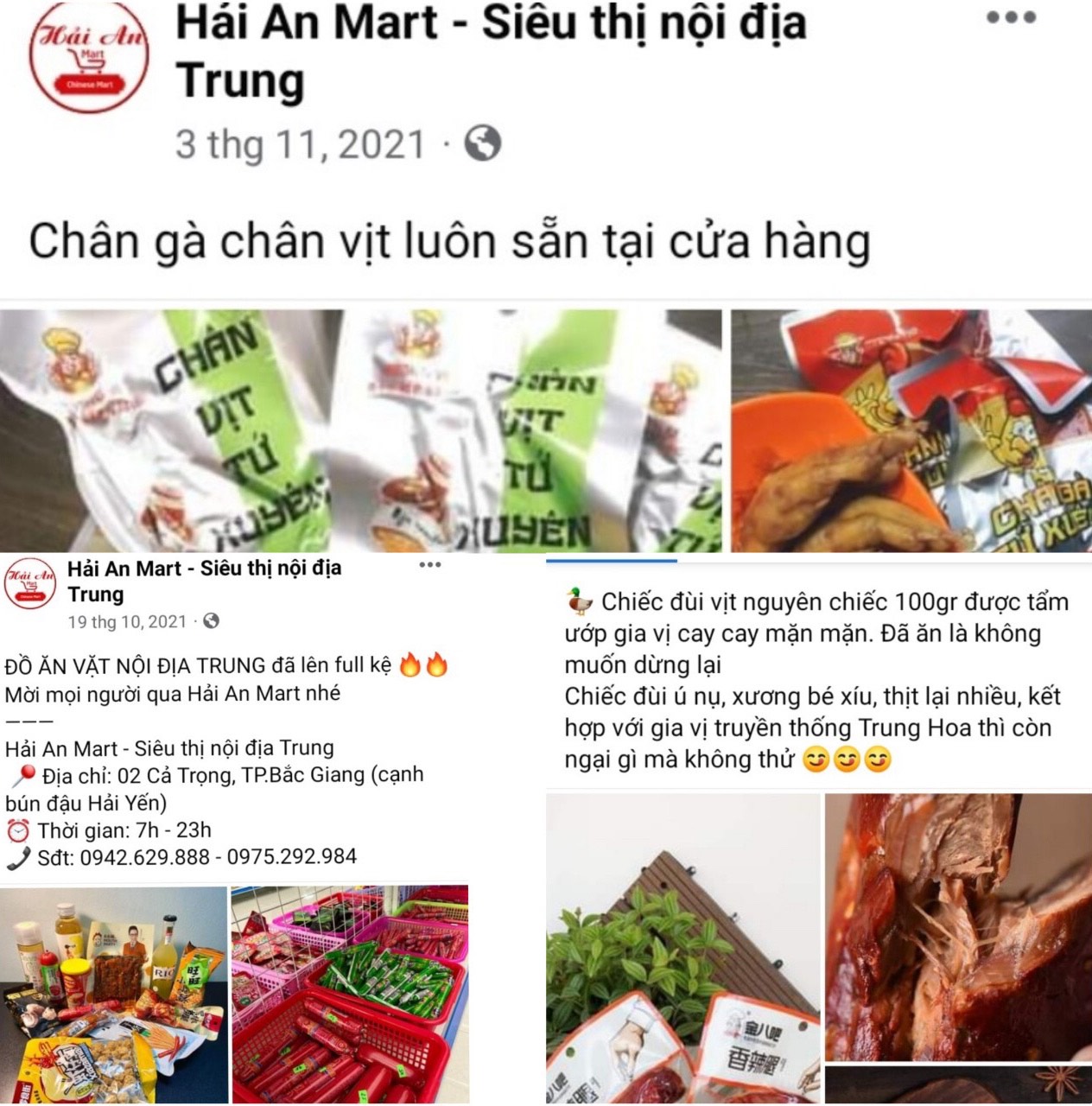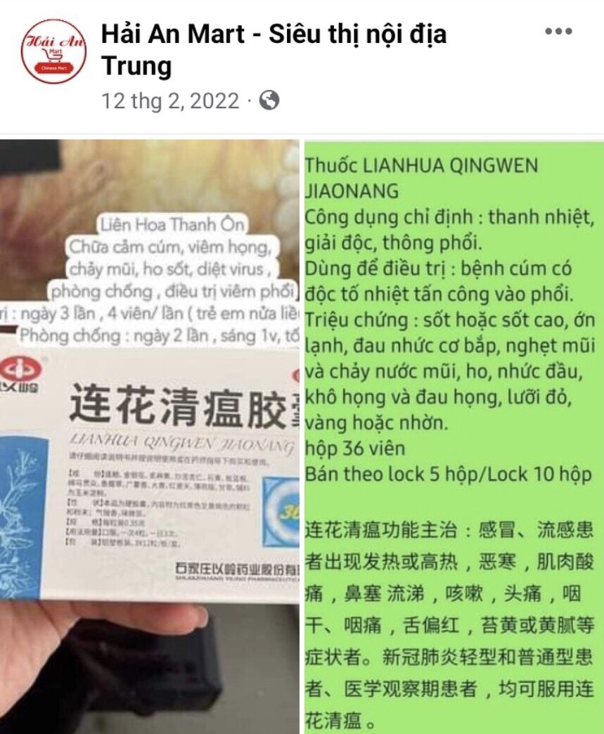 Sản phẩm thuốc điều trị bệnh cúm và thuốc Covid được Hải An Mart quảng cáo trên fanpage: Hải An- Siêu thị nội địa Trung, cũng như bày bán công khai tại siêu thị số 02 đường Cả Trọng, thành phố Bắc Giang.