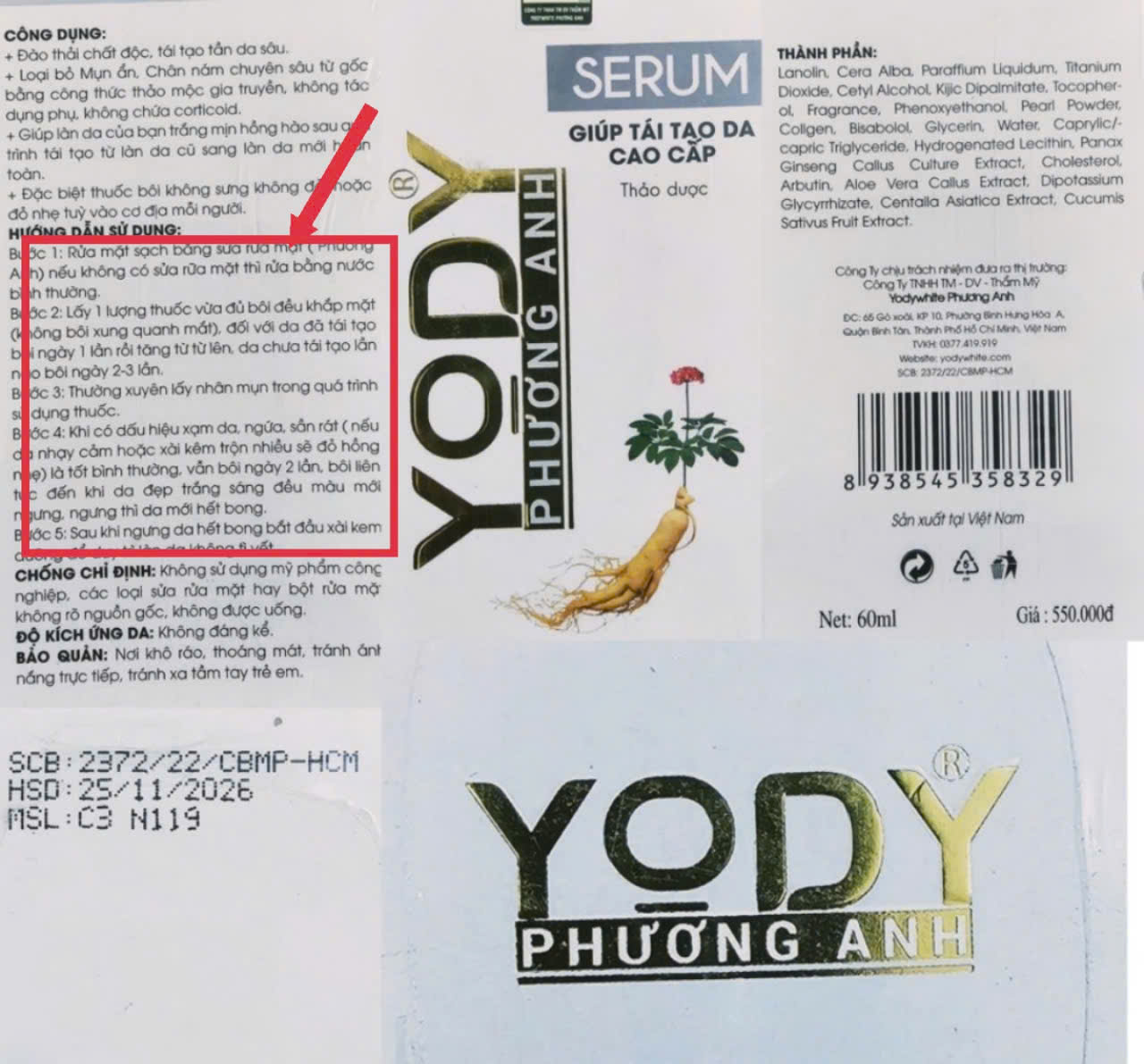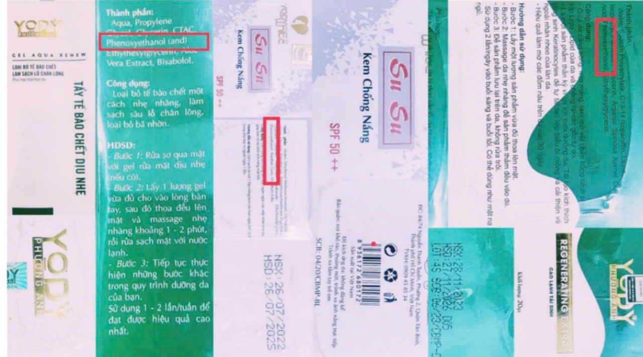 Thực tế, những chất này hiện hữu trong rất nhiều sản phẩm mang thương hiệu Yody Phương Anh: SERUM tái tạo trắng da; Su Skin trắng da tái tạo; SERUM giúp tái tạo da cao cấp thảo dược; Kem ức chế nám trắng da; Dung dịch vệ sinh phụ nữ Valley; Kem dưỡng trắng da 3X; Cream Plus; SERUM dưỡng da Hyaluron;… thế nhưng không có bất ký thông tin cảnh báo nào được ghi trên nhãn hàng hóa.