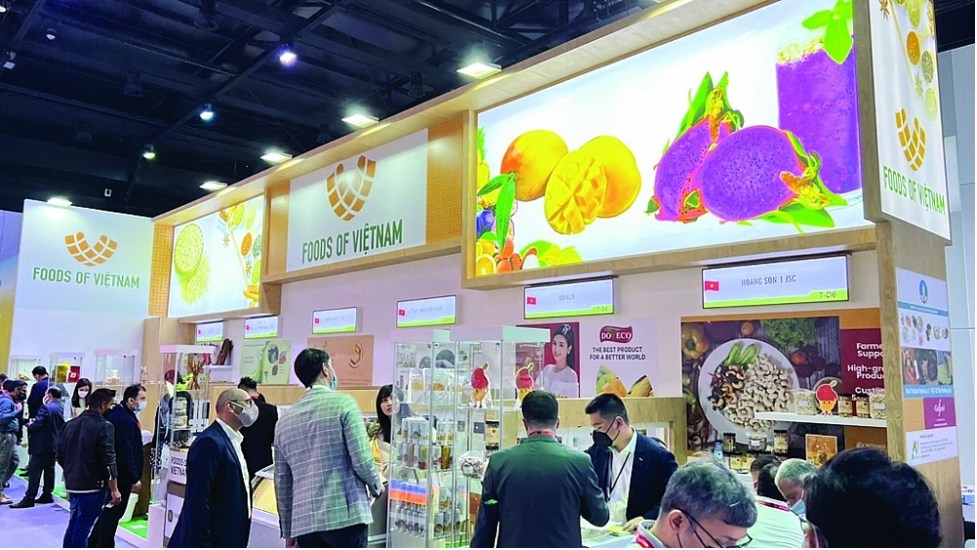 Khu gian hàng Việt Nam trong lĩnh vực nông sản, thực phẩm chế biến tại Hội chợ Gulfood Dubai 2022 (UAE). Ảnh: ST