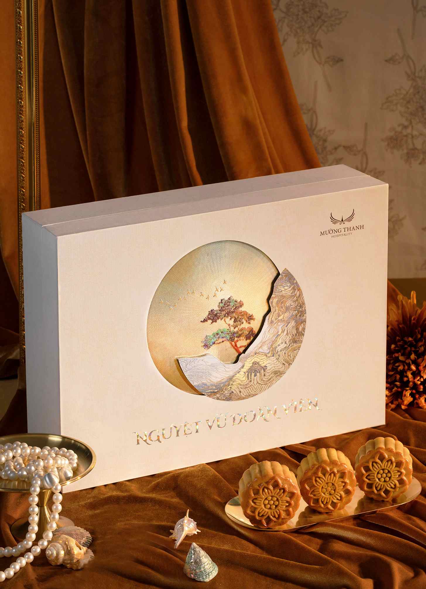 Điểm nhấn ấn tượng nhất của “Nguyệt Vũ Đoàn Viên” chính là thiết kế hộp bánh lấy cảm hứng từ nghệ thuật khảm trai truyền thống, một nghề thủ công tinh xảo được lưu truyền qua nhiều thế hệ, là kết tinh của sự khéo léo, kiên nhẫn và óc thẩm mỹ của người Việt. Mỗi họa tiết khảm trai là kết quả của hàng chục công đoạn tỉ mỉ, đòi hỏi đôi tay và lòng yêu nghề sâu sắc. Đây là sự lựa chọn đầy chủ ý của Mường Thanh nhằm tái hiện một thương hiệu truyền thống của cha ông, đưa nghề khảm trai trở về hiện diện rạng rỡ giữa đời sống hiện đại.