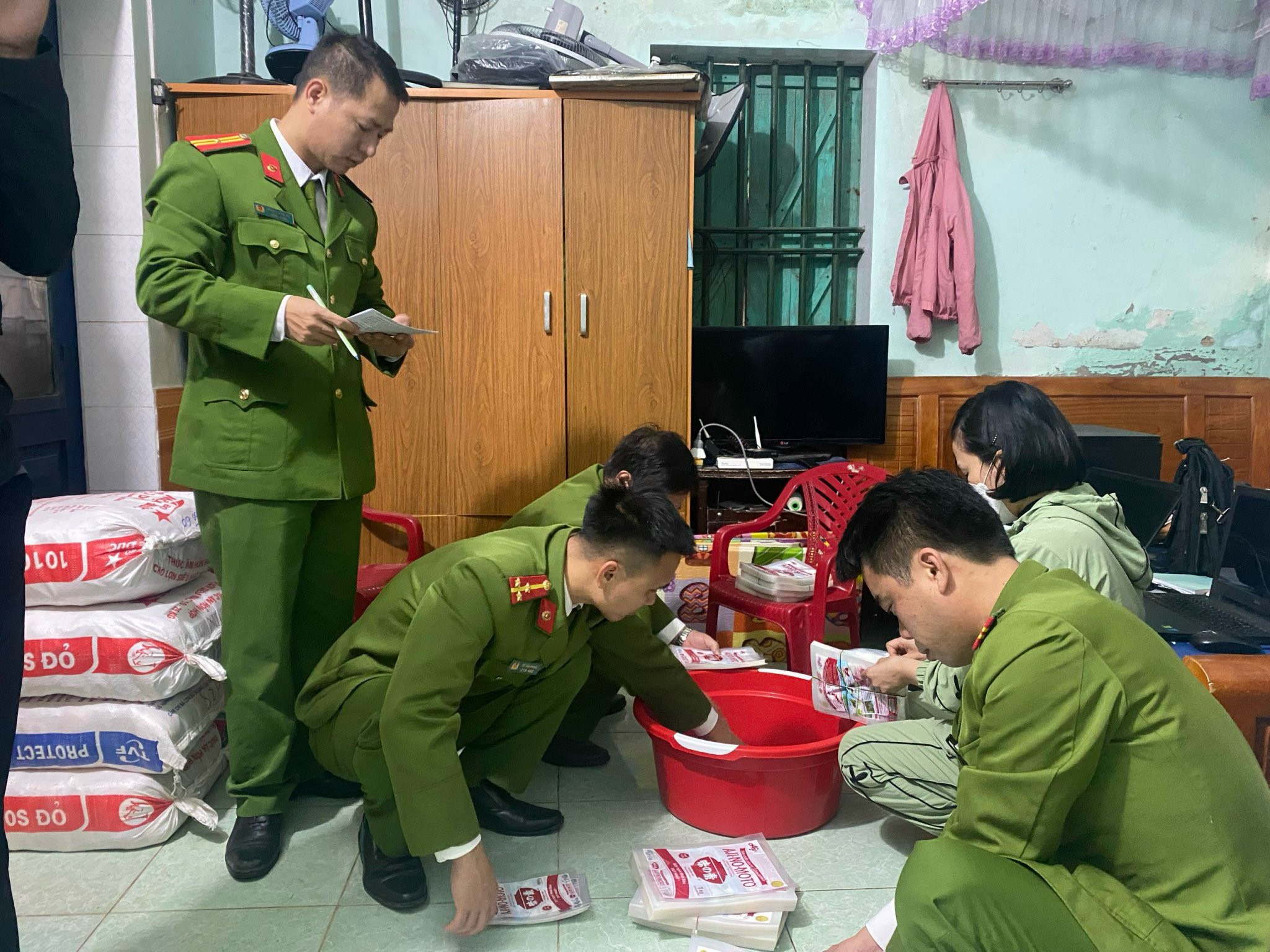 Lực lượng chức năng Công an tỉnh Thái Bình kiểm tra và thu giữ những gói mì chính không rõ nguồn gốc. (Ảnh: Công an Thái Bình cung cấp).