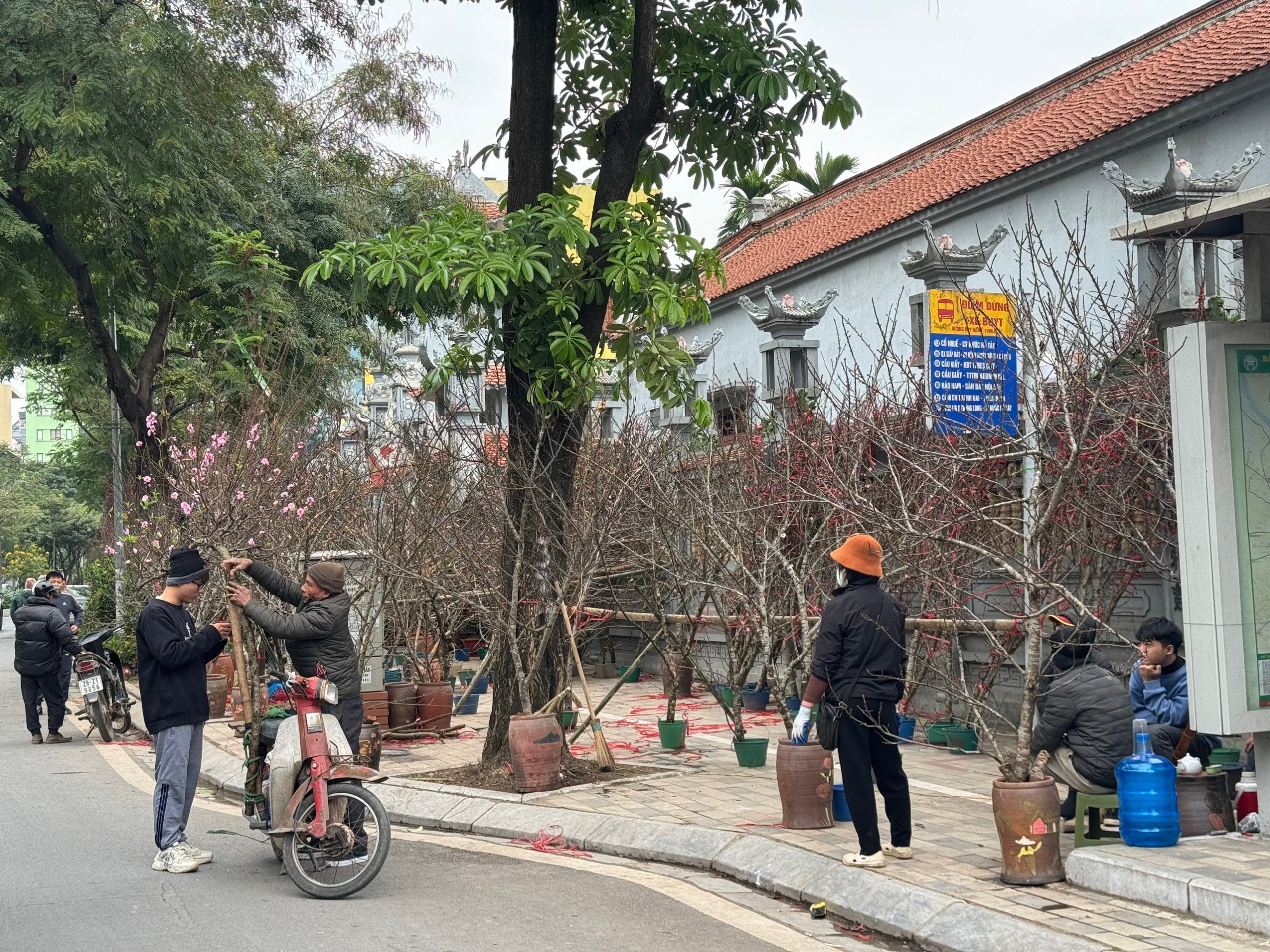 Trên các tuyến phố ở quận Tây Hồ, Hà Nội, đào, quất, cây cảnh,… đã được các tiểu thương trưng bày kín hai bên đường để người dân thuận tiện chọn lựa mua sắm.