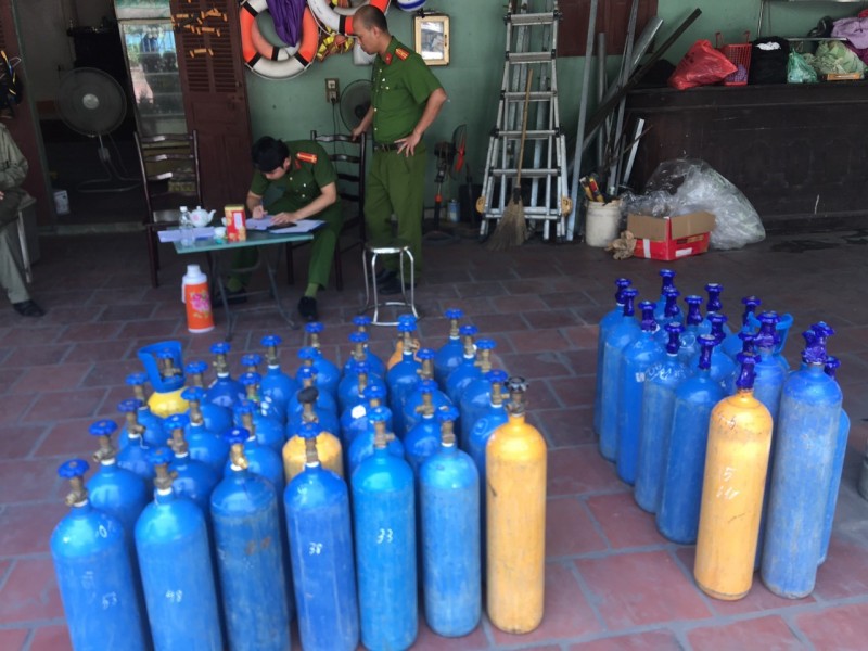 (CHG) Tại một quán karaoke trên địa bàn TP. Uông Bí, lực lượng quản lý thị trường tỉnh Quảng Ninh đã kiểm tra, phát hiện cơ sở đang tàng trữ trái phép 53 bình khí nén bằng kim loại chứa khí N20. Số bình này khá đa dạng, nặng từ 10 - 14kg với tổng trọng lượng lên đến hơn 600kg.