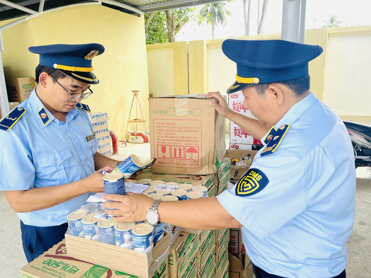 Qua kiểm tra, Đoàn kiểm tra phát hiện trên xe vận chuyển hàng hóa là thực phẩm gồm: kẹo xịt, với số lượng 3.000 lọ; Xúc xích, số lượng 7.200 túi và kẹo mềm, số lượng 4.800 viên, toàn bộ hàng hóa nêu trên đều được đóng trong hộp giấy carton, có nhãn gốc bằng tiếng nước ngoài, có xuất xứ nước ngoài và không có nhãn phụ bằng tiếng Việt Nam.