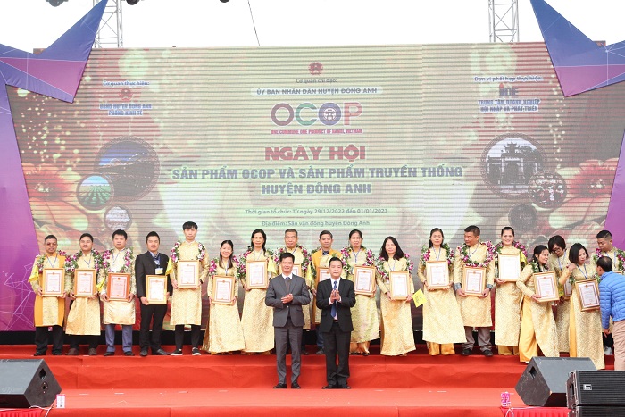 Tại “Ngày hội sản phẩm OCOP và sản phẩm truyền thống huyện Đông Anh năm 2022”, UBND huyện đã trao Giấy chứng nhận tham dự sự kiện trưng bày cho các chủ thể OCOP và nhấn nhấn nút khai mạc Ngày hội. Chương trình được diễn ra trong 4 ngày từ 29/12/2022 - 01/01/2023.