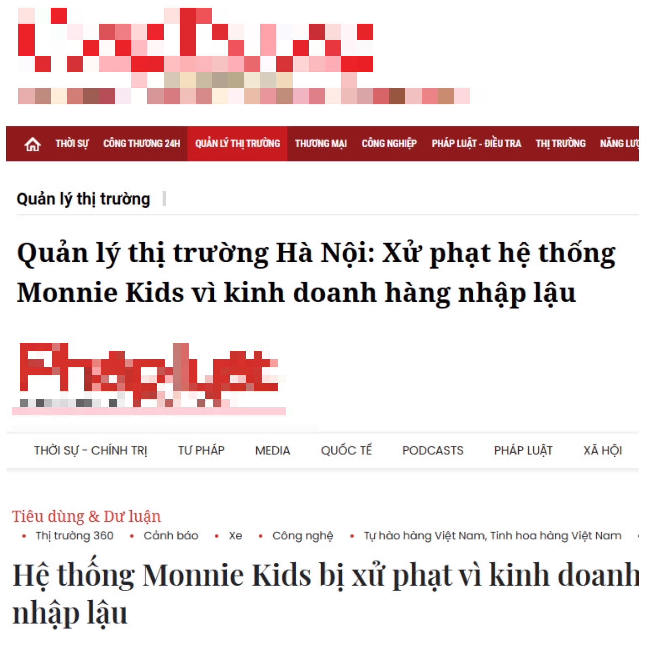 Vừa qua, Tạp chí điện tử Kỹ thuật Chống hàng giả và Gian lận thương mại đã đăng tải các bài viết:” Hà Nội: Chuỗi cửa hàng đồ sơ sinh cao cấp Monnie Kids ngang nhiên bày bán hàng hóa không nhãn phụ Tiếng Việt”; “Monnie Kids có đủ điều kiện kinh doanh thuốc tân dược?” và “Monnie Kids vi phạm trên diện rộng?”. Nội dung 03 bài viết trên ghi nhận ý kiến người tiêu dùng phản ảnh tới Tổng đài Chống hàng giả (Quỹ Chống hàng giả) về việc một số cửa hàng mang thương hiệu Monnie Kids bày bán nhiều sản phẩm không nhãn phụ tiếng Việt, có dấu hiệu hàng không rõ nguồn gốc xuất xứ, hàng nhập lậu và kinh doanh thuốc tân dược sai quy định của pháp luật.
