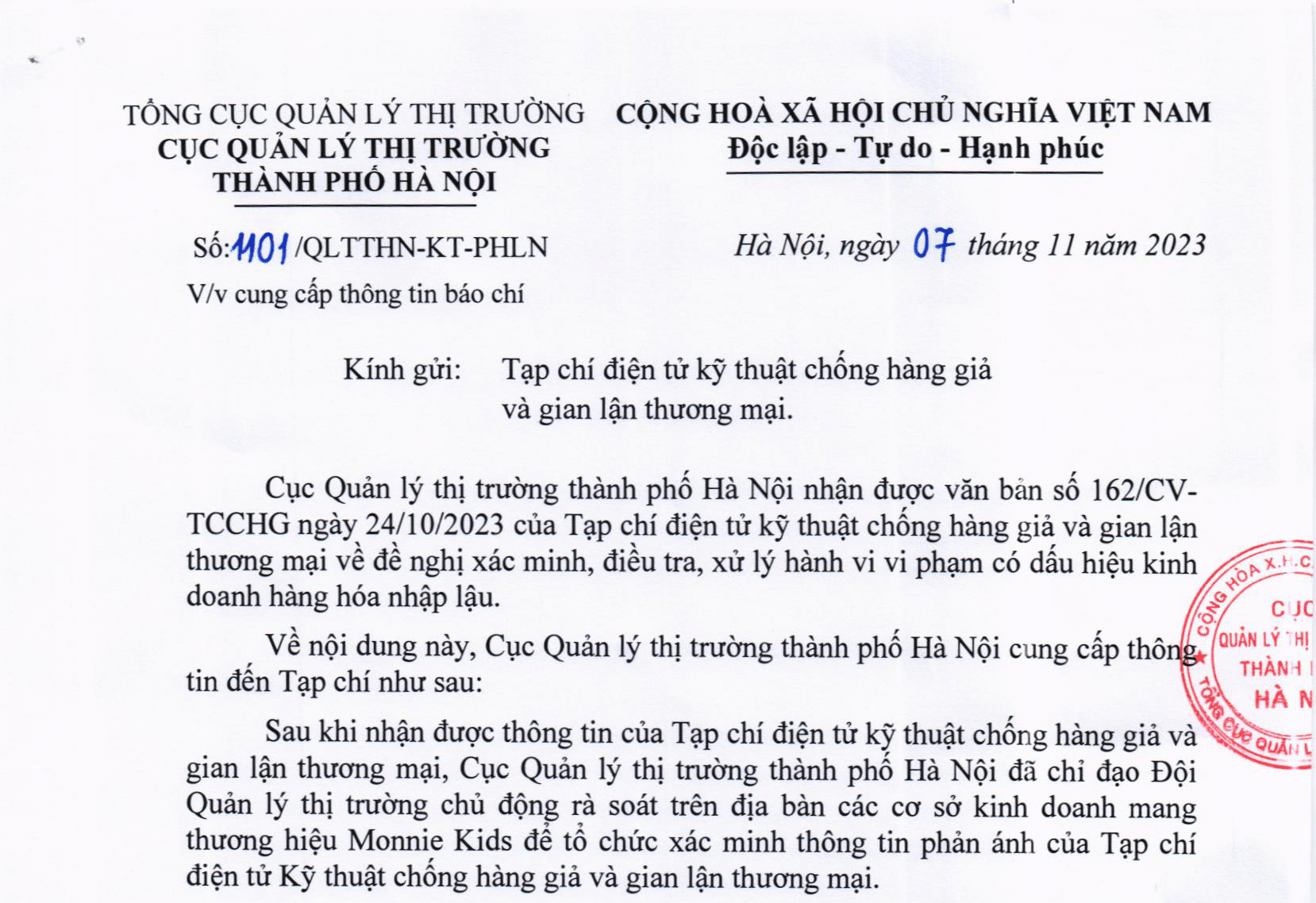 Văn bản số 1101/QLTTHN-KT-PHLN của Cục Quản lý thị trường Hà Nội về việc cung cấp thông tin báo chíSau khi nhận được thông tin của Tạp chí CHG, ngày 07/11/2023, Cục Quản lý thị trường Thành phố Hà Nội đã có văn bản số 1101/QLTTHN-KT-PHLN về việc đã chỉ đạo Đội Quản lý thị trường chủ động rà soát trên địa bàn các cơ sở kinh doanh mang thương hiệu Monnie Kids để tổ chức xác minh thông tin phản ánh của Tạp chí. Nội dung văn bản nêu rõ một số hành vi vi phạm về thương mại điện tử: