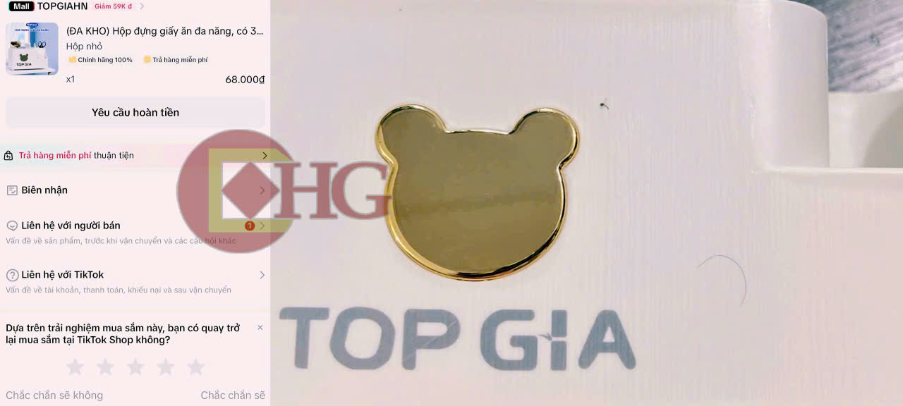 Sản phẩm "Hộp đựng giấy đa năng" mang thương hiệu Top Gia "trắng" thông tin, không rõ nguồn gốc xuất xứ. Một số sản phẩm còn được đóng gói sơ sài, không nhãn hàng hoá, không hộp, không niêm phong, cho thấy sự buông lỏng trong cả khâu kiểm soát chất lượng lẫn bảo vệ quyền lợi người tiêu dùng. Tình trạng này không chỉ gây khó khăn cho người tiêu dùng trong việc đánh giá chất lượng, mà còn tiềm ẩn rủi ro nghiêm trọng về an toàn sức khỏe.