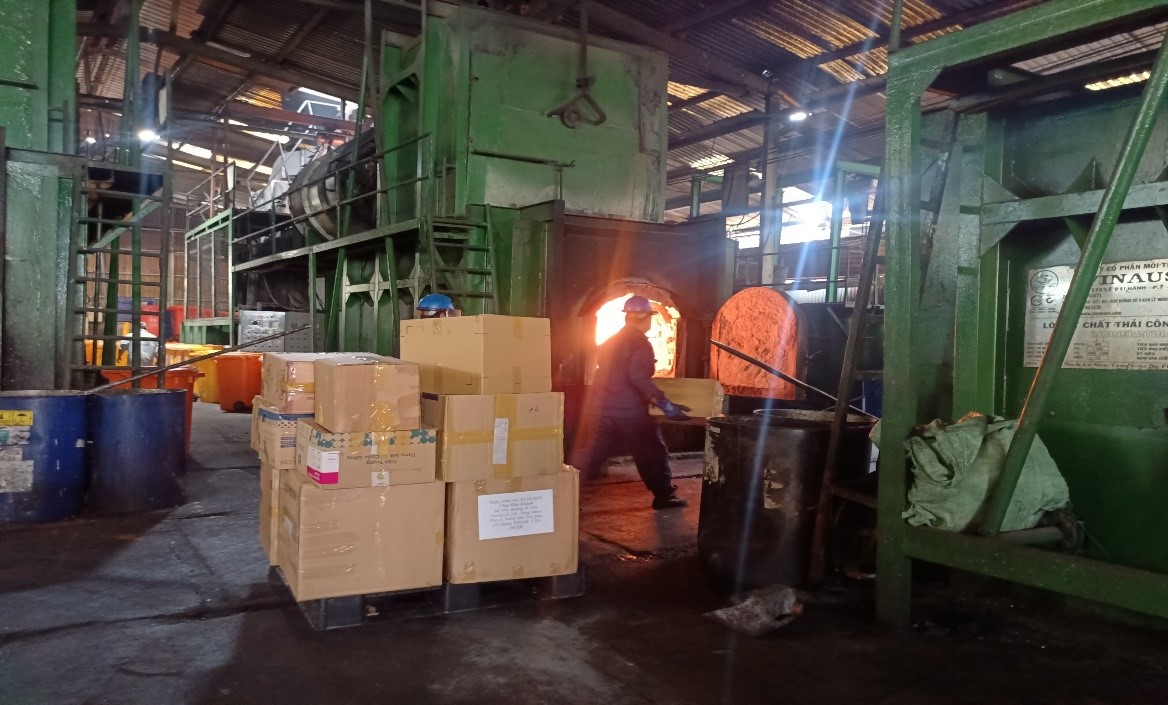 Lực lượng chức năng giám sát quy trình tiêu hủy hàng hóa tại Nhà máy xử lý và tái sinh chất thải của Công ty Công ty Cổ phần Môi trường Việt Úc.