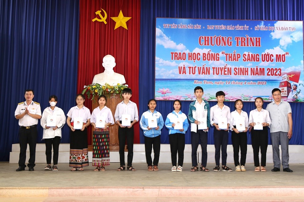 Chiều 14/4, tại Trường Trung học phổ thông (THPT) dân tộc nội trú tỉnh Kon Tum, Tổng công ty Tân Cảng Sài Gòn phối hợp với Ban Tuyên giáo Tỉnh ủy và Sở Giáo dục và Đào tạo tỉnh Kon Tum tổ chức chương trình trao học bổng “Thắp sáng ước mơ” và tư vấn tuyển sinh vào Học viện Hải quân năm 2023 cho hơn 400 em học sinh lớp 12 thuộc các trường THPT trên địa bàn TP. Kon Tum.