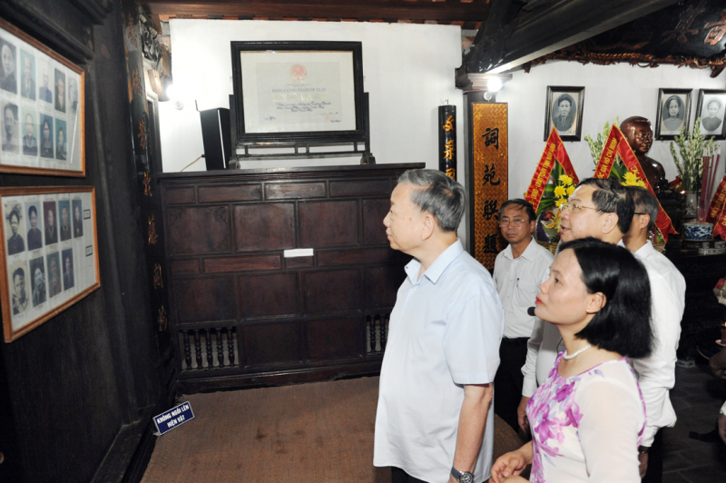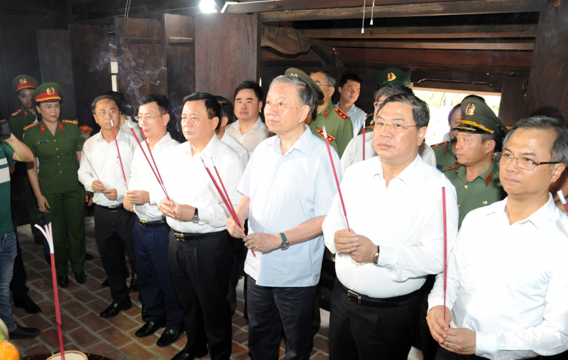 Bộ trưởng Tô Lâm cùng đồng chí Nguyễn Xuân Thắng và các đại biểu dâng hương tưởng niệm Tổng Bí thư Trường Chinh tại Nhà lưu niệm Tổng Bí thư Trường Chinh.