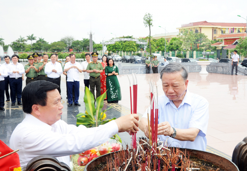 Bộ trưởng Tô Lâm cùng đồng chí Nguyễn Xuân Thắng dâng hương, dâng hoa tưởng niệm Tổng Bí thư Trường Chinh tại tượng đài Tổng Bí thư Trường Chinh.